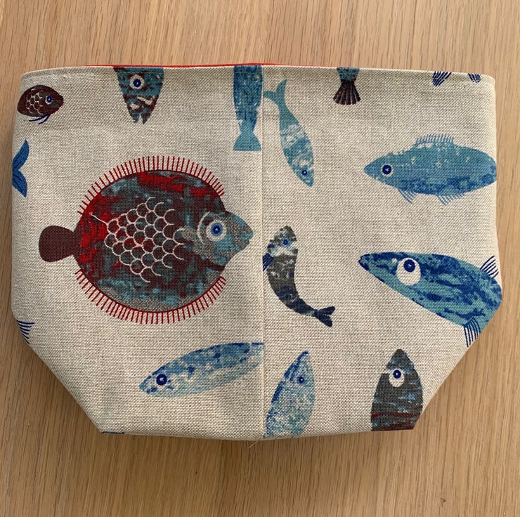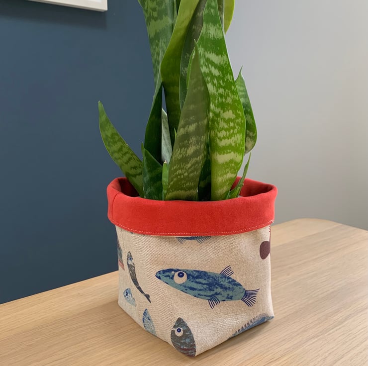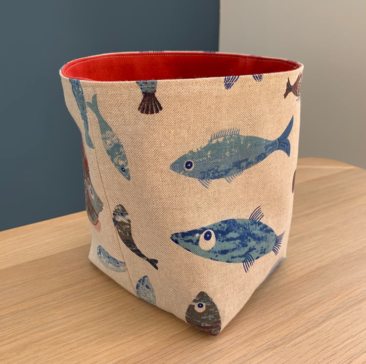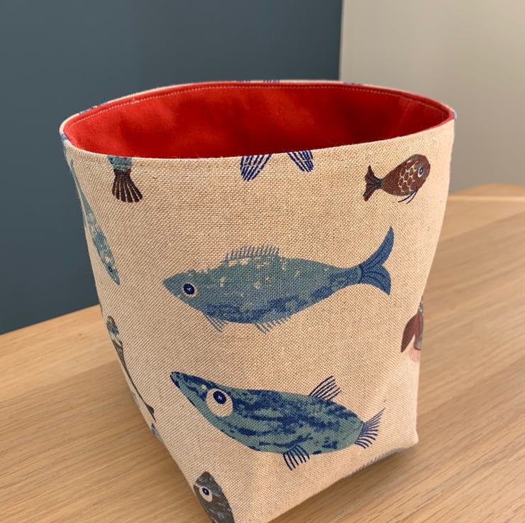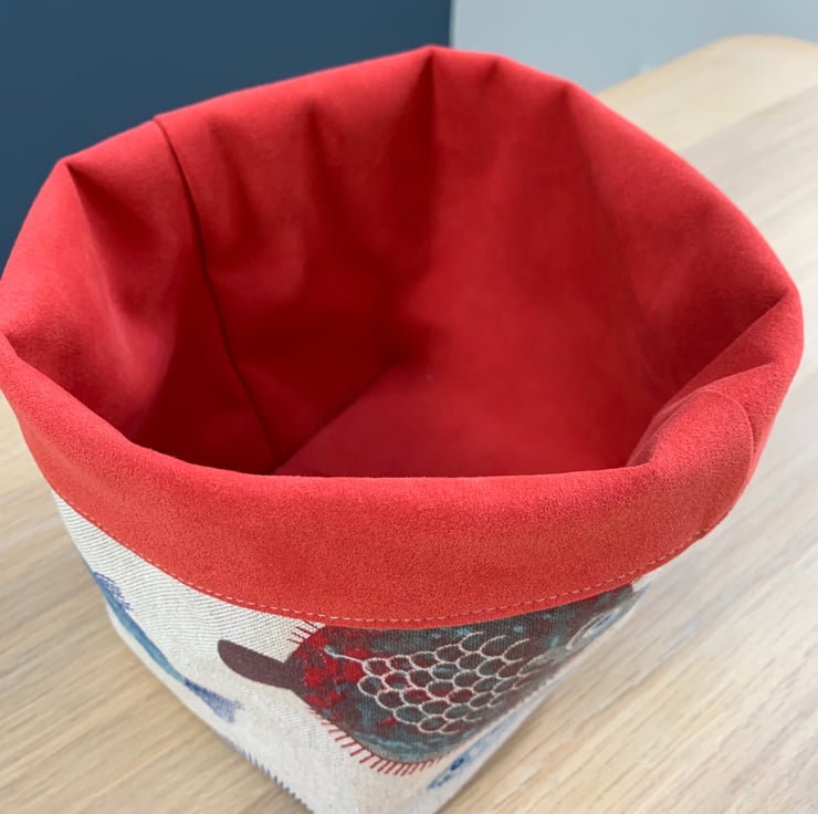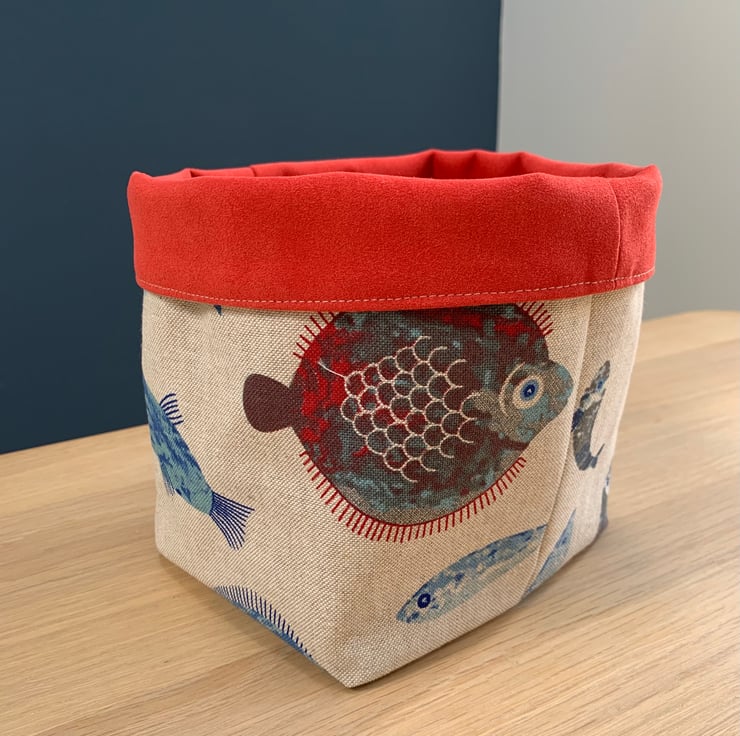 Reversible fabric basket made from soft red faux suede and cute fish print cotton. Can be used with a turn-down to make the most of the contrasting fabrics.