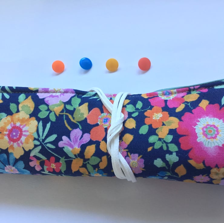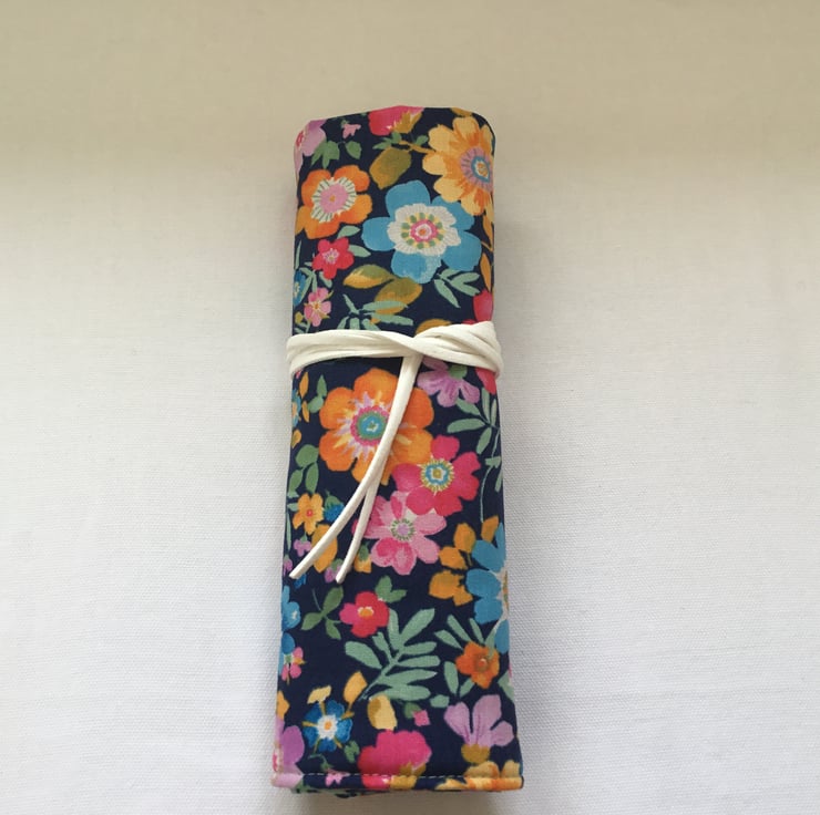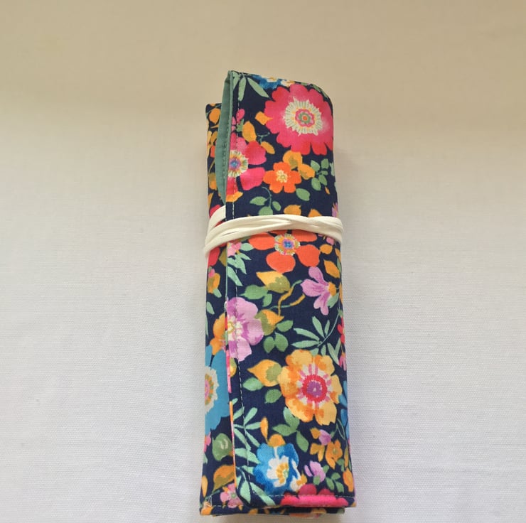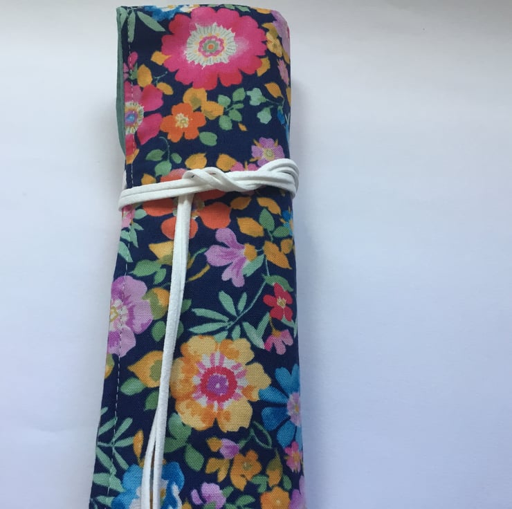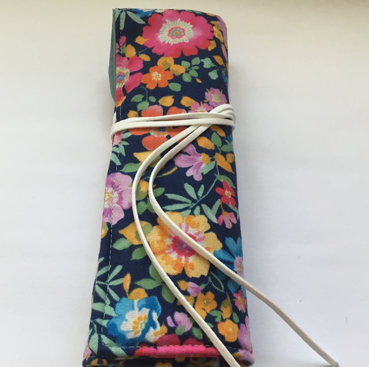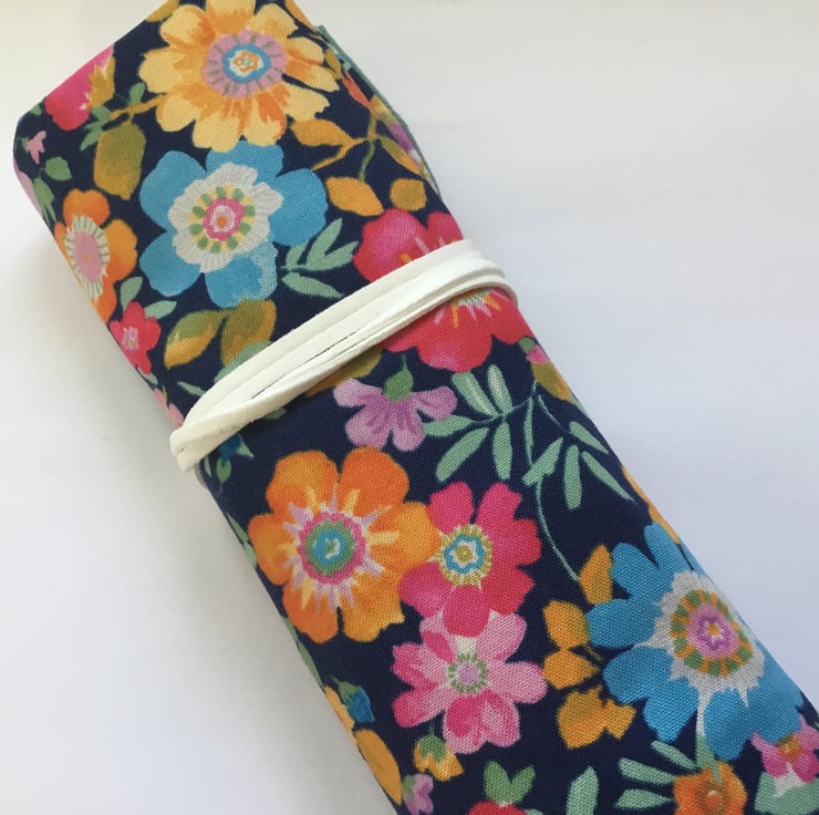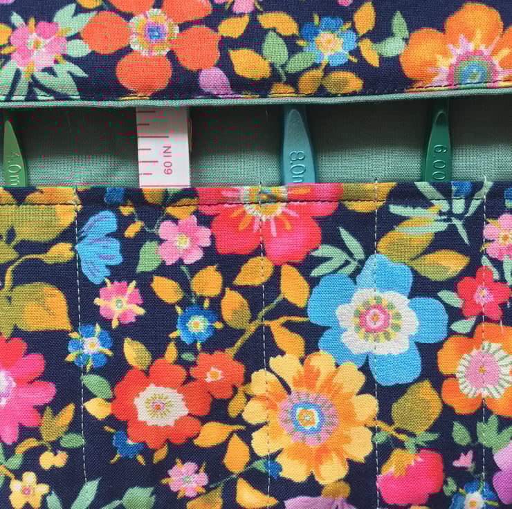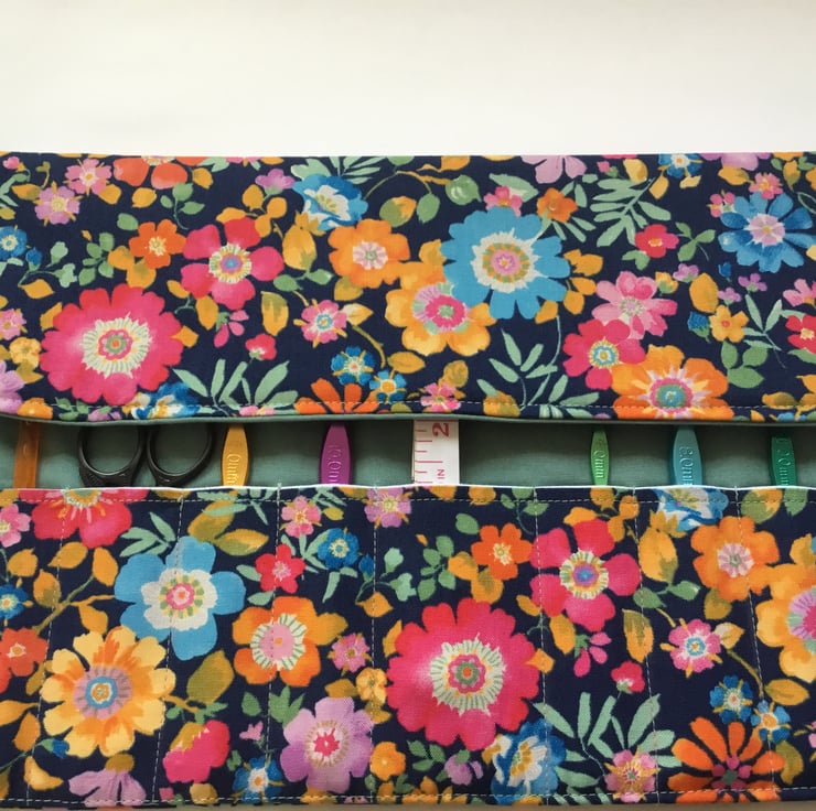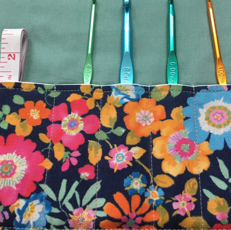 Crochet hook roll bag in a bright floral fabric by Moda with a coordinating lining and soft interfacing. There are 11 pockets approximately 3cm wide with one larger pocket, each pocket will hold more than one of the slim type hooks. Please note the scissors and hooks are not included.