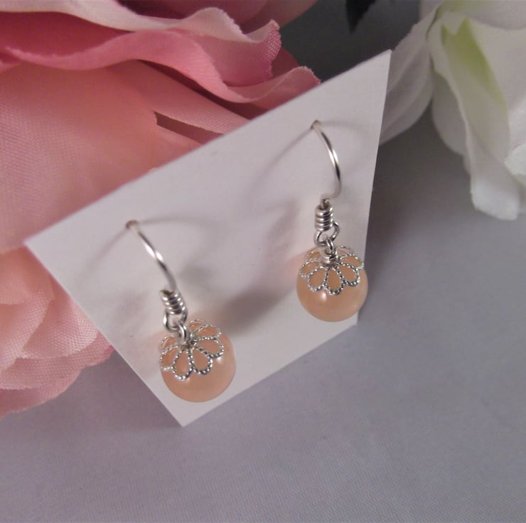 The 8 mm bead is topped with a filigree design sterling silver bead cap and has a wrapped loop at the top which connects the earring to the handmade sterling silver ear wire.