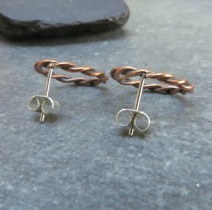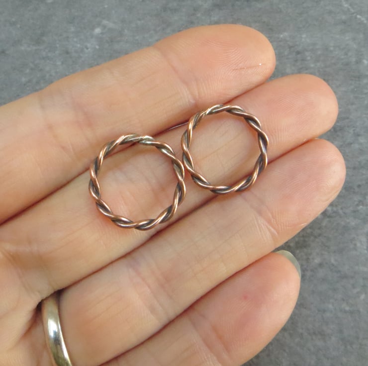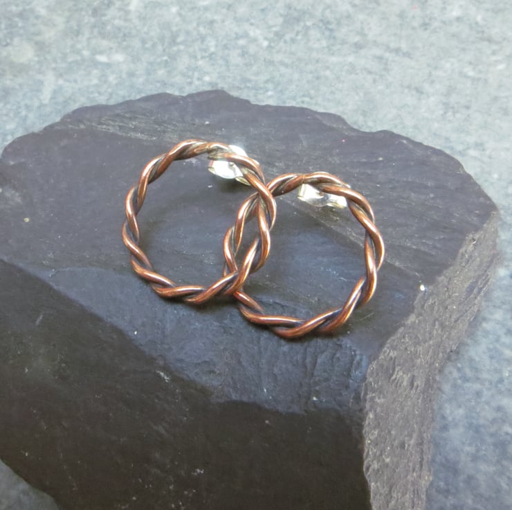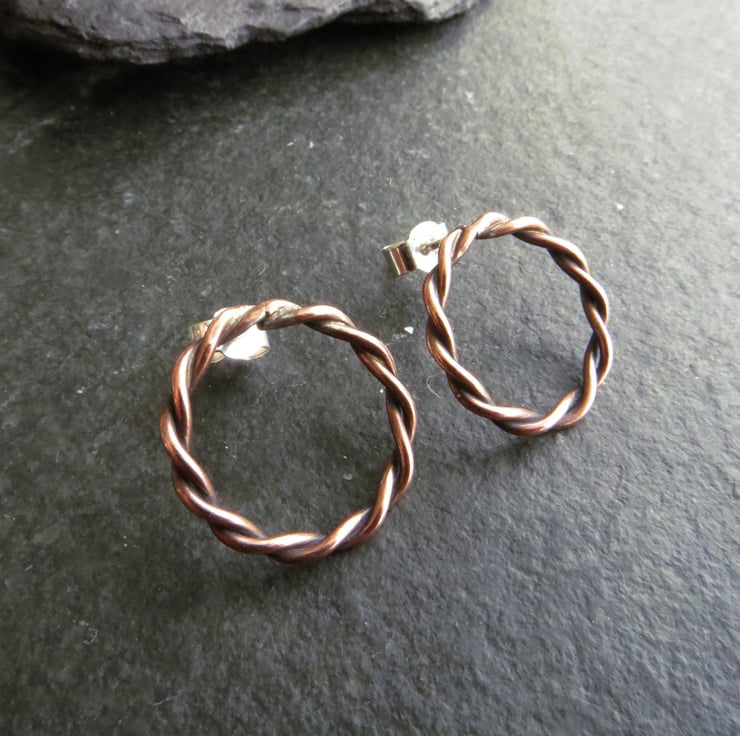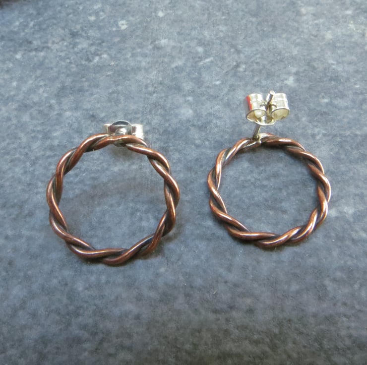 These front facing hoops are made from two lengths of solid copper wire which have been twisted together and formed into circles. The ends are soldered together and sterling silver ear posts attached. The twisted circle studs have been oxidised and polished to highlight the twist pattern, and they come complete with sterling butterfly backs.