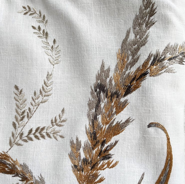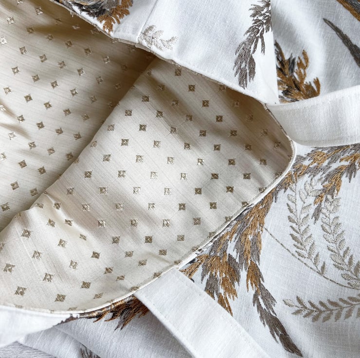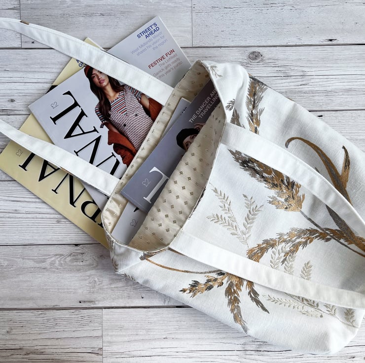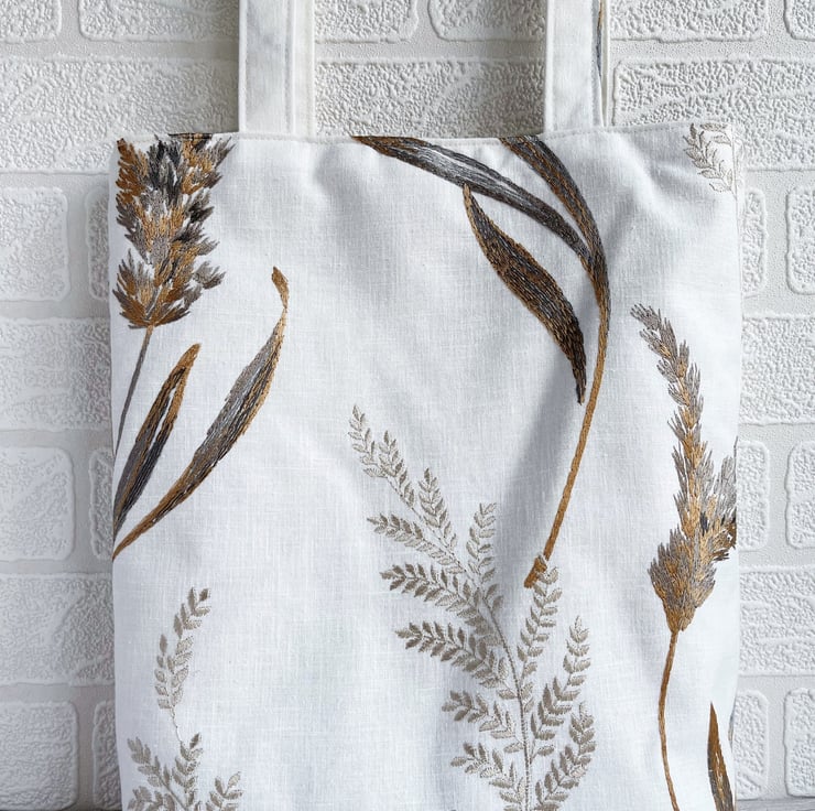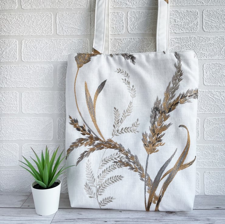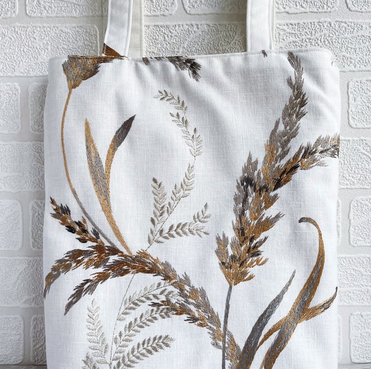 Grass seed heads tote bag in embroidered pattern fabric. This stylish and unusual tote bag is made from white fabric with a gorgeous embroidered pattern. The pattern features large grass stems and seed heads. The colours are subtle and elegant shades of golden-brown, pale gold, and many shades of grey, from a pale silver-grey through to charcoal. The slight sheen of the embroidered pattern gives a stylish and luxurious touch. The bag is lined with pale gold satin with a woven pattern of small diamonds.
