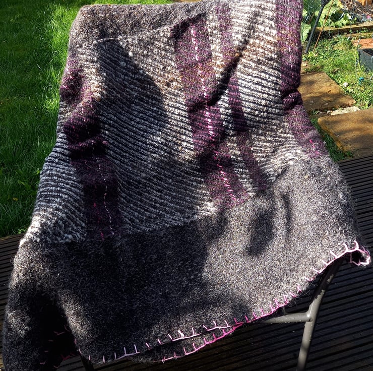 Made from handspun yarn of Hebridean and Shetland fleeces with a dash of purple and pink milk cotton to add a touch of colour. Length: 2m Width: 1.05m