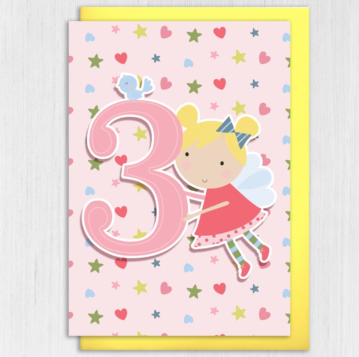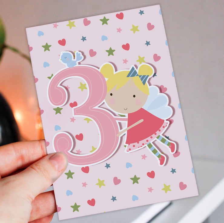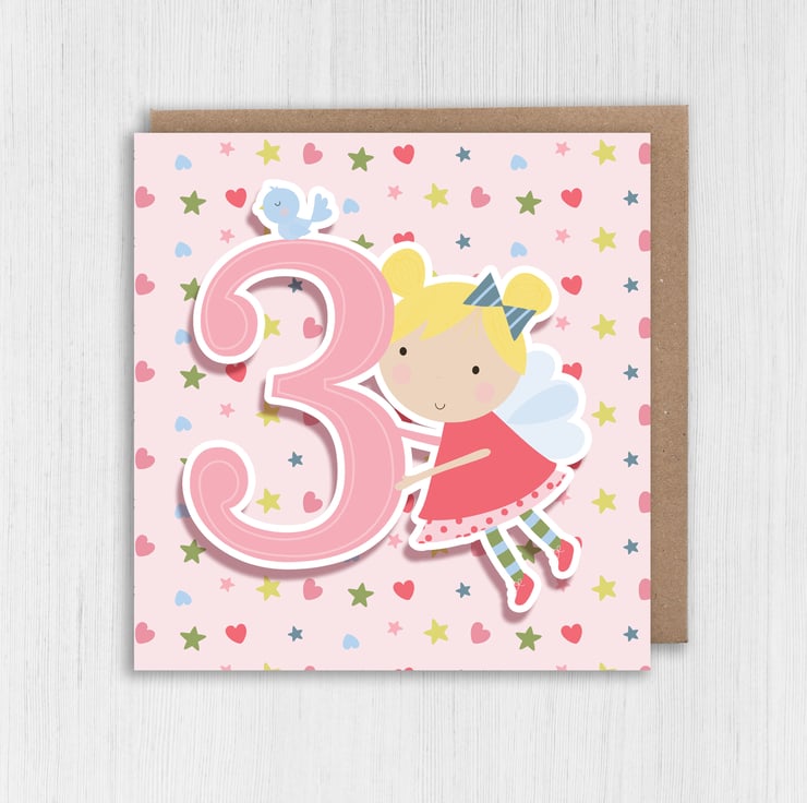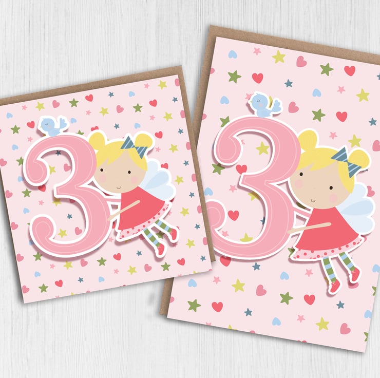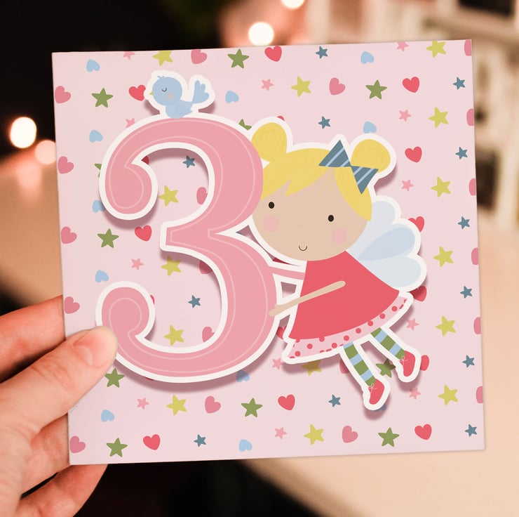 Fairy children, kid, child, boy, girl 3rd birthday card (Size A6/A5/A4/Square 6x6")