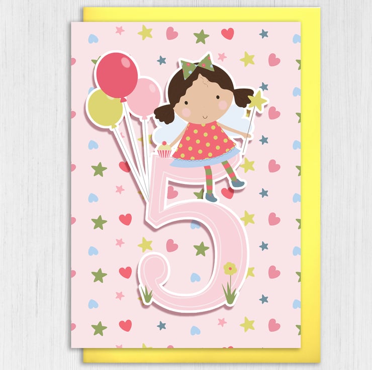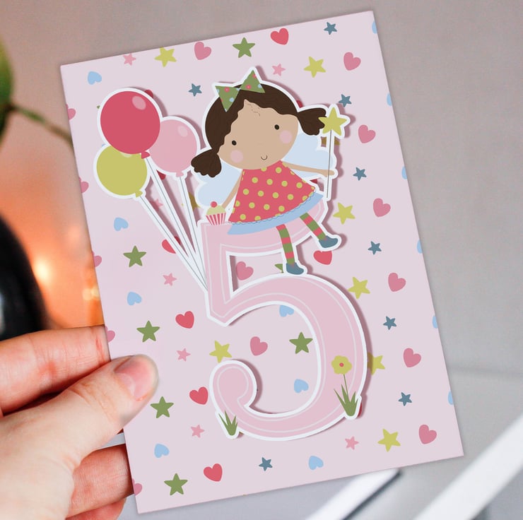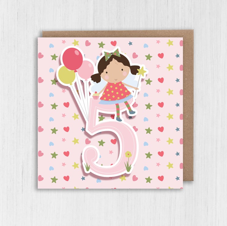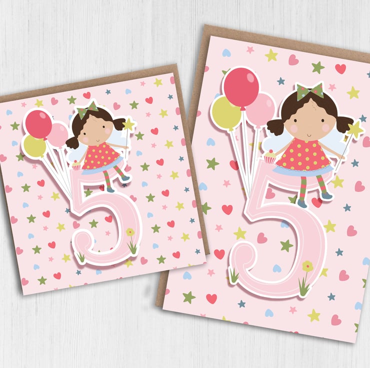 Fairy children, kid, child, boy, girl 5th birthday card (Size A6/A5/A4/Square 6x6")