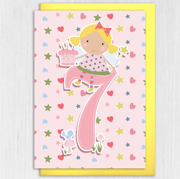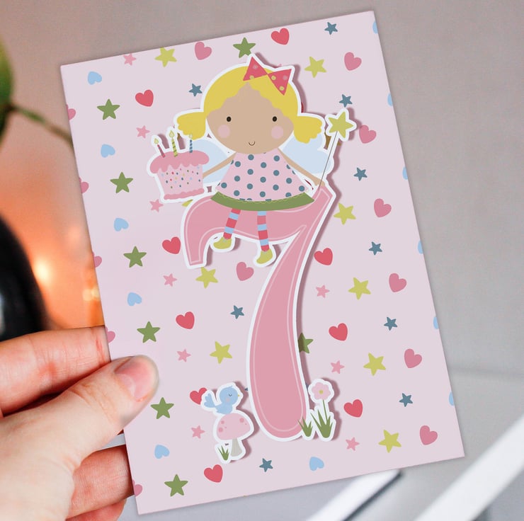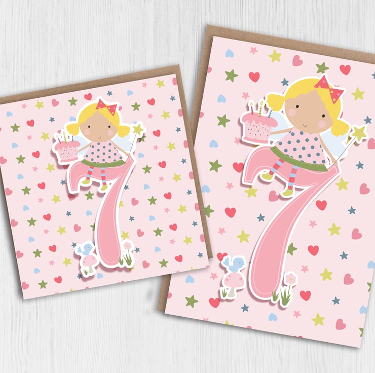 Fairy children, kid, child, boy, girl 7th birthday card (Size A6/A5/A4/Square 6x6")