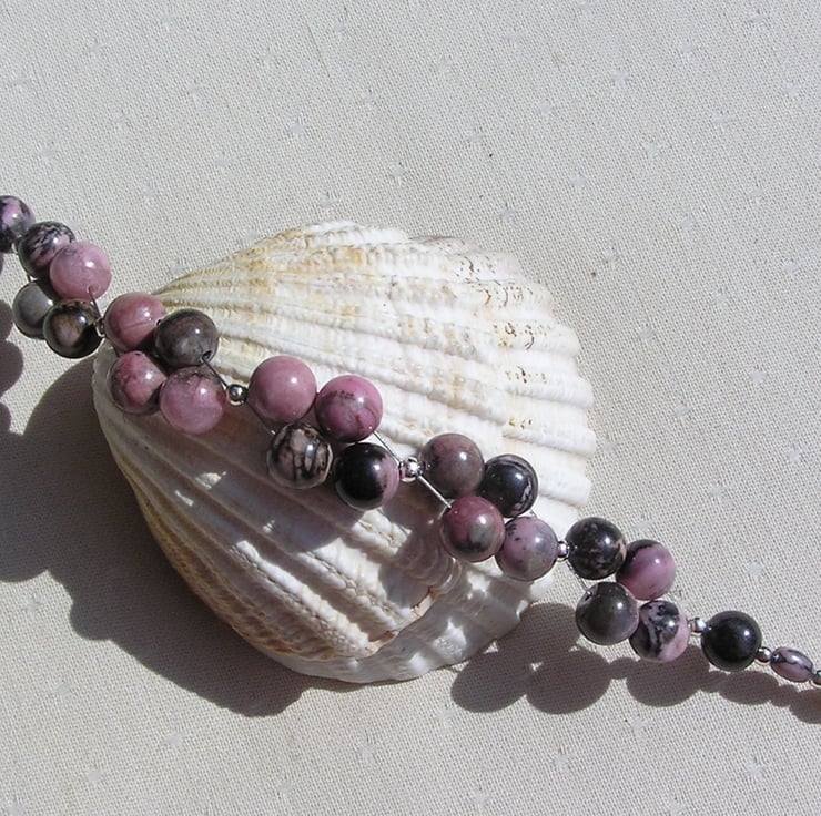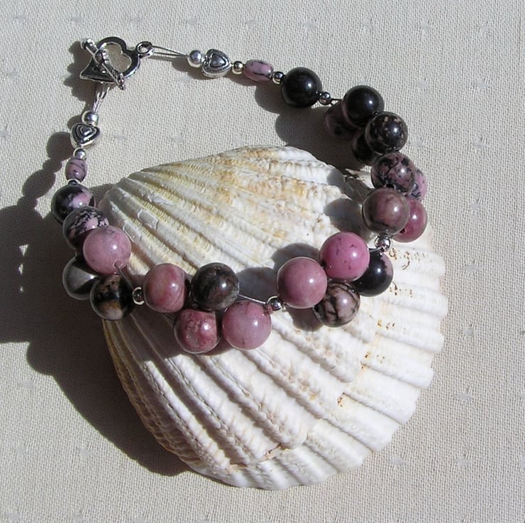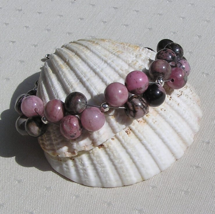 This Stunning Bracelet is made wholly from Rhodonite round beads clustered together in four's (with the black marbling effect no two beads are the same) and for that added bit of sparkle tiny Silver spacer beads - a Rich Rosy effect that will look stunning either worn casually or with something more Elegant for a Special Evening out
