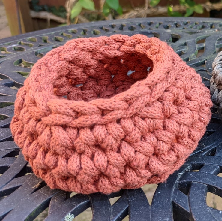 A cute little crocheted bowl in Terracotta colour made with a high quality recycled cotton braided cord which has a polyester core. The bowl is sturdy yet flexible and keeps its shape. The cord gives great definition to the crochet stitches used to create it.