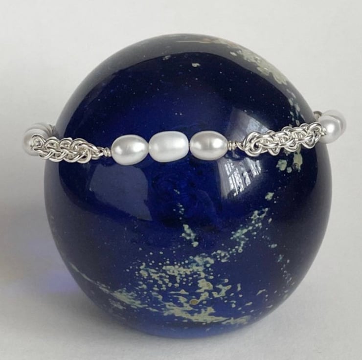 Pearls and sterling silver make a beautiful combination and there are three sections of pearls, three pearls in each section with the chainmaille chains in between the pearl section.