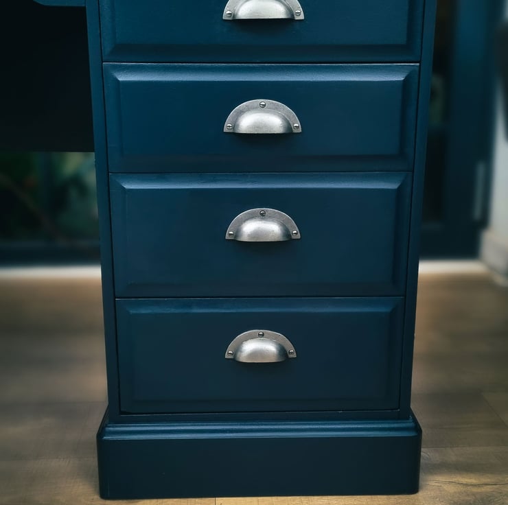 The old desk was stripped of it's worn mahogany veneer before being painted with 2x coats of Farrow and Ball Dark Tones Undercoat, followed by 2x coats of Railings No.31 topcoat in estate eggshell. The desk was then coated in several layers of Polyvine varnish for added durability, and the original tattered hardwear has been replaced with stunning vintage cast iron pull handles.