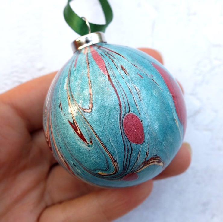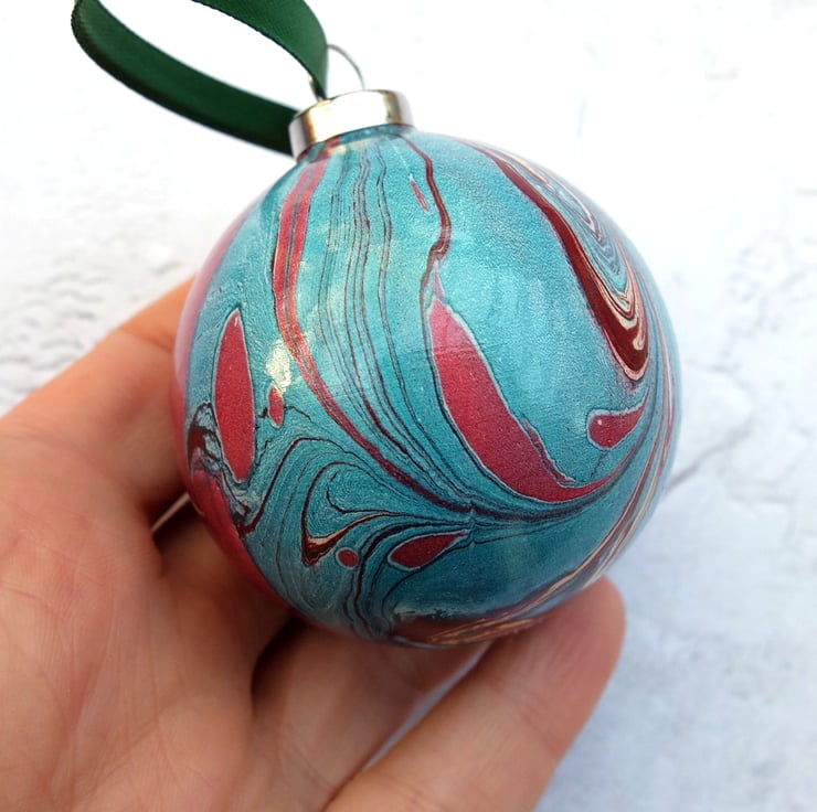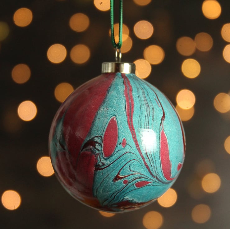 The baubles in this range are marbled directly onto the ceramic surface - a technique which is much more difficult than it sounds! Each bauble is marbled from a different bath, so they are all different and totally unique. They are lots of fun to make and totally addictive!