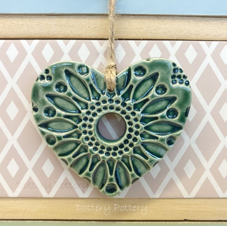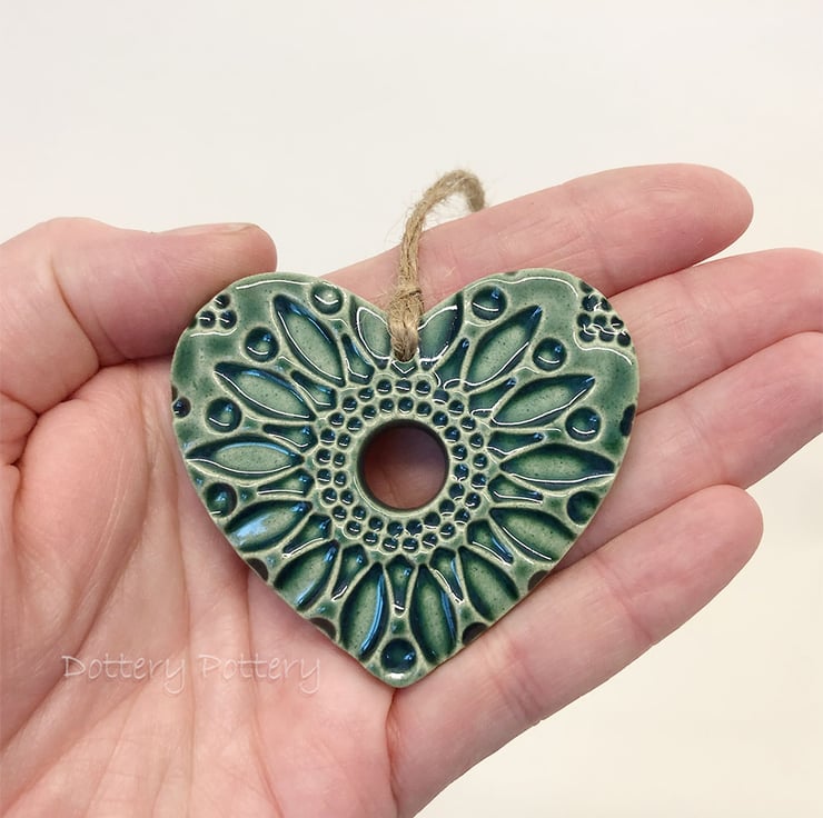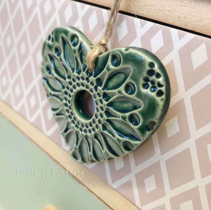 Small Ceramic heart hanging decoration Pottery Heart Folk art Emerald