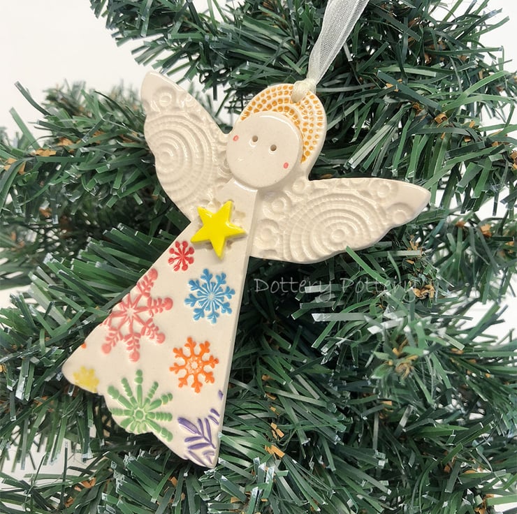 This cute little angel is made from white earthenware clay and decorated with coloured snowflakes. It has been finished with a clear, glossy glaze. Fired twice. Glazed on the front only. It measures 8.5 cm high and 7 cm wide and hangs from a cream organza ribbon. (snowflake pattern placement and multicolours will vary from angel to angel, so you may not get the exact angel photographed here but it will be just as lovely)