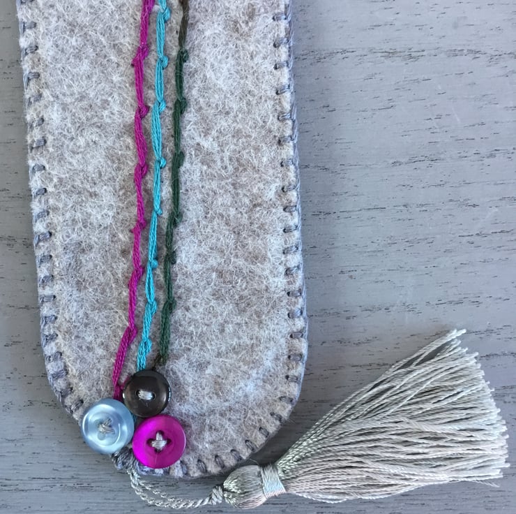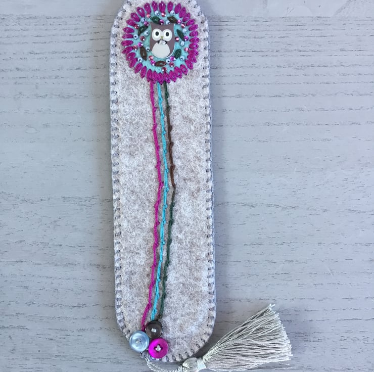 This grey felt Owl Bookmark is hand embroidered with an owl button stitched onto a circle of pale blue felt, edged with a border of dark pink Lazy-Daisy Stitches. This owl is surrounded by dark green Lazy-Daisy Stitches and dark pink and grey seed beads. Three rows of Scroll Stitches are hand embroidered to three small buttons and a grey tassel at the bottom of the bookmark. The bookmark is edged with grey Blanket Stitches.