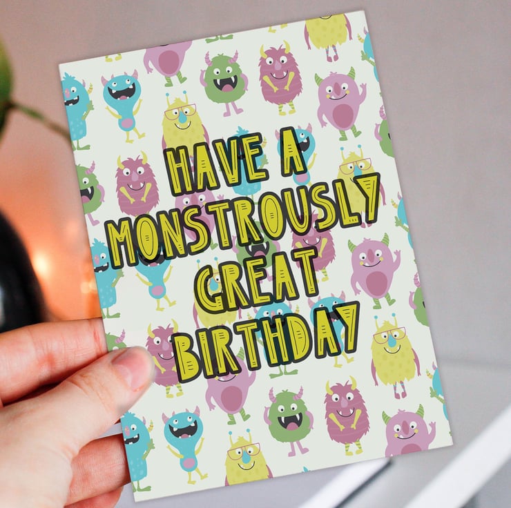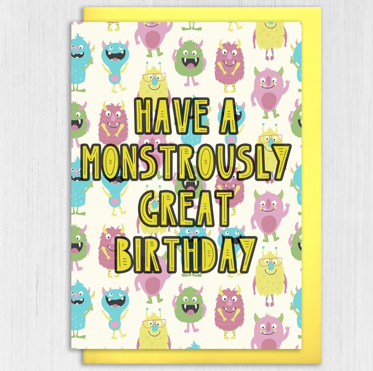 Children's, kid's, child's monster birthday card: Have a monstrously great birthday (Size A6/A5/A4/Square 6x6")