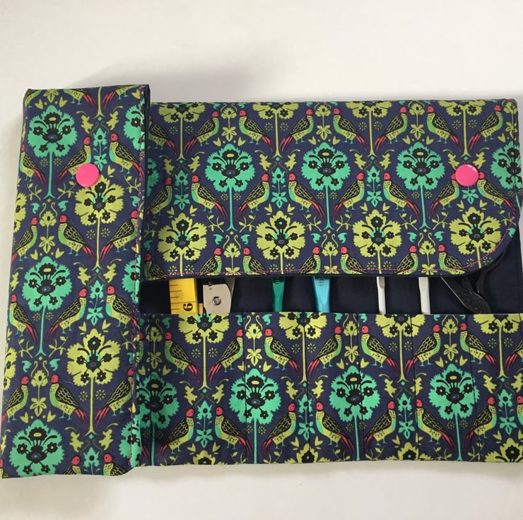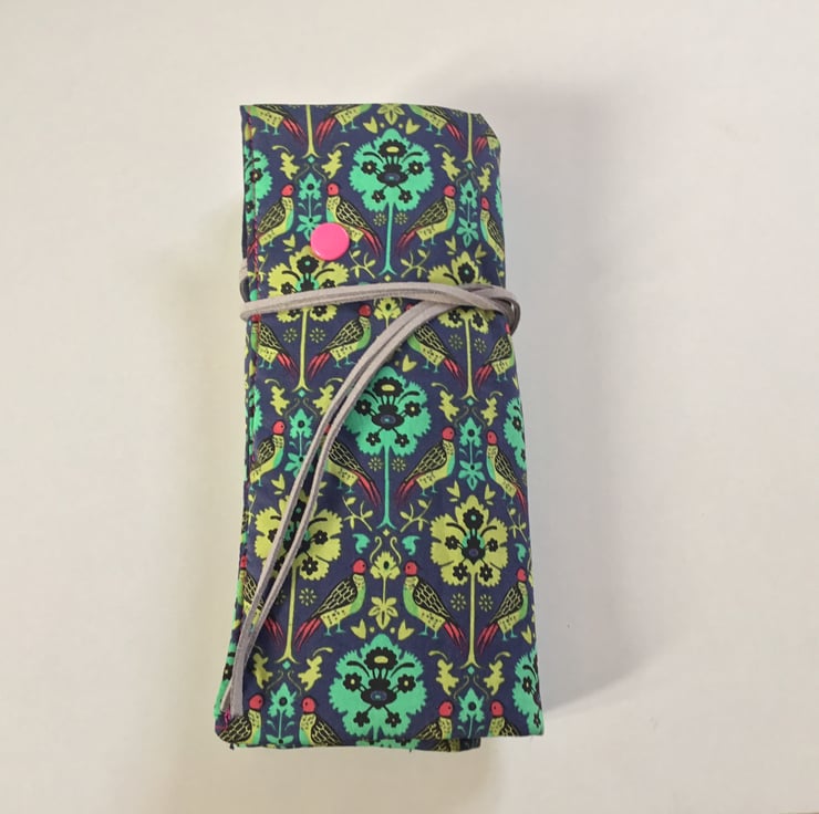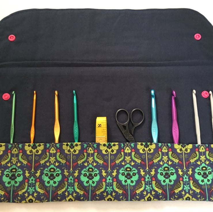 Crochet hook roll in Liberty Tana lawn fabric, lined with a navy cotton. There are 11 pockets of sizes 2.5cm, 3cm and 5cm for a variety size of hooks. Approximately 35cm when opened flat and 19cm tall.
