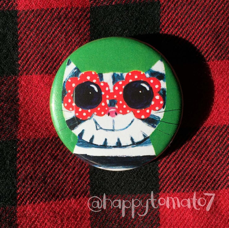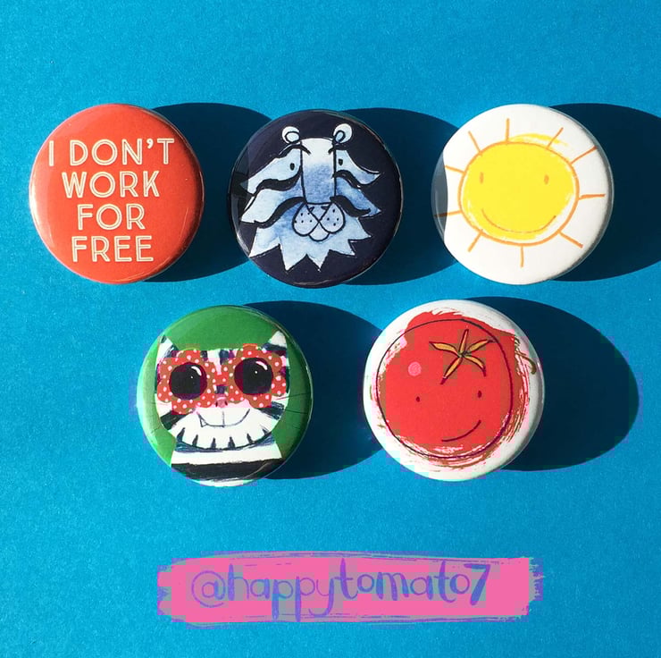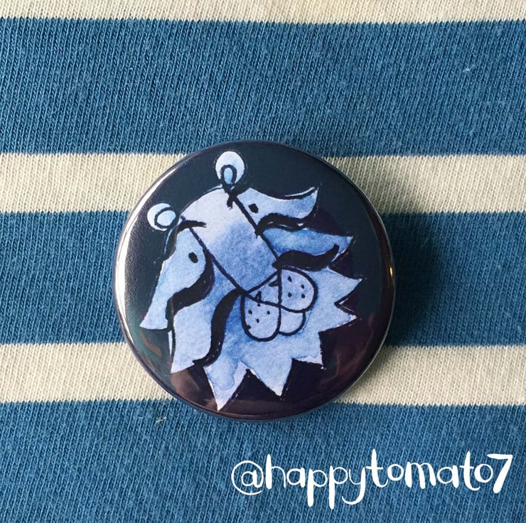 quirky brightly coloured badge with design from an original illustration by Jo Brown