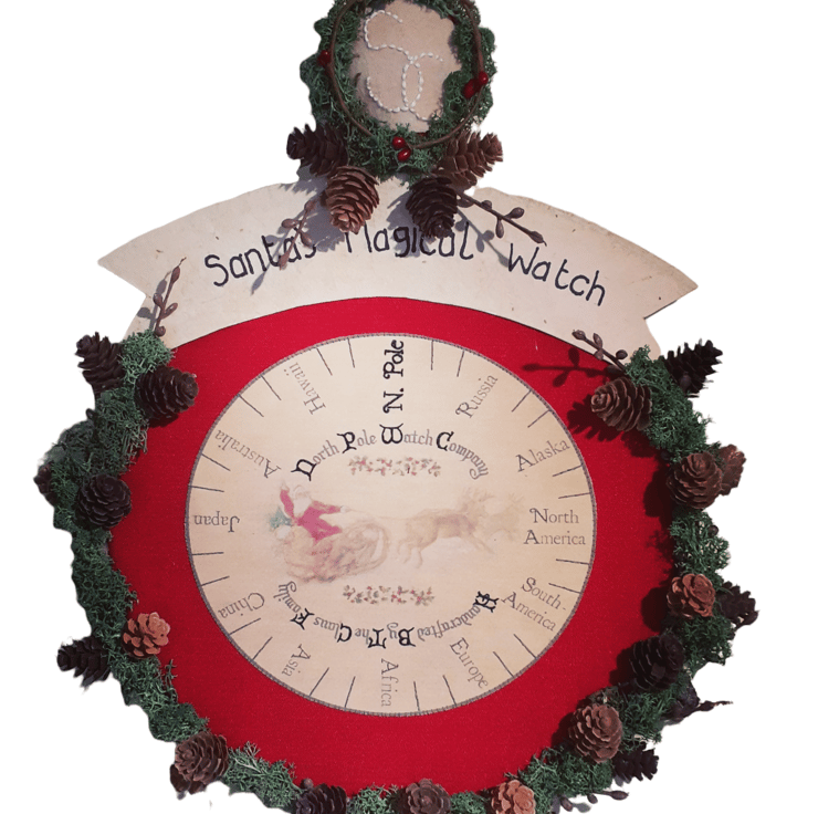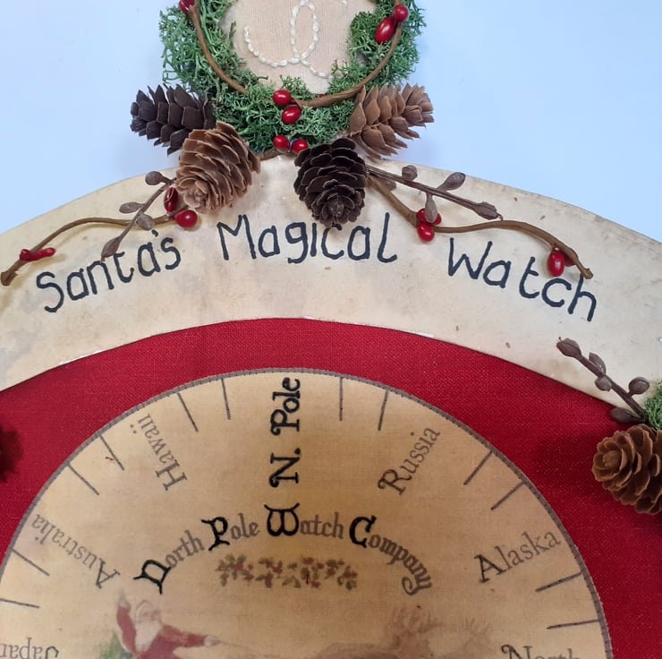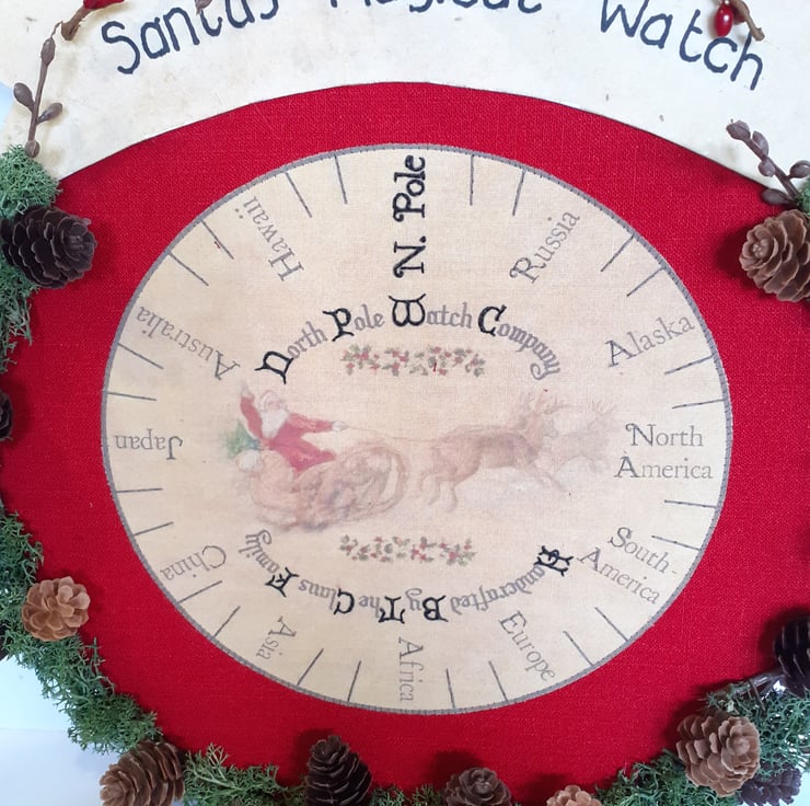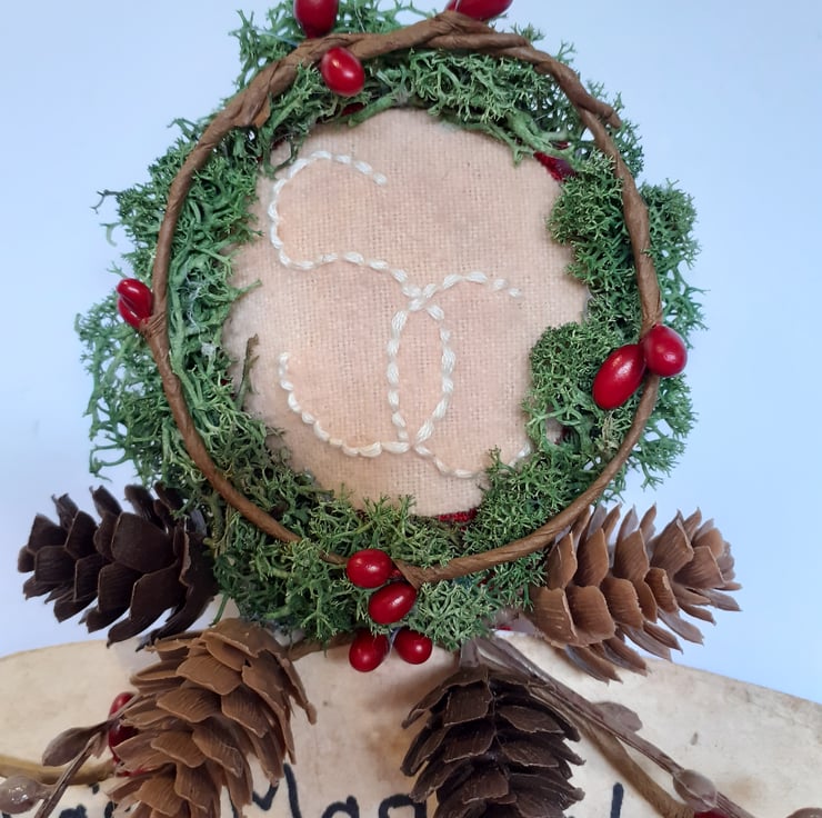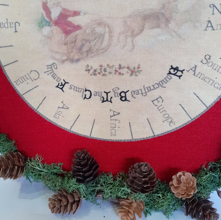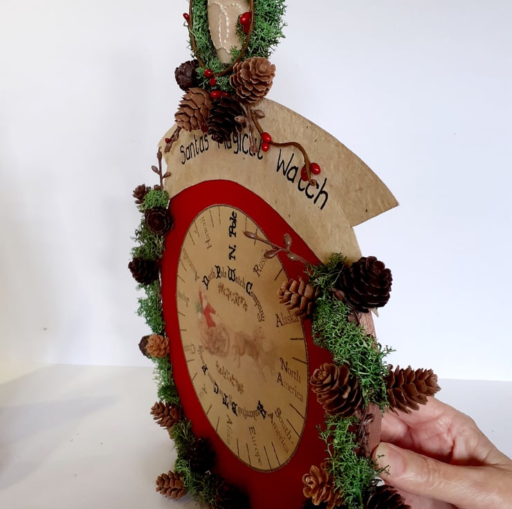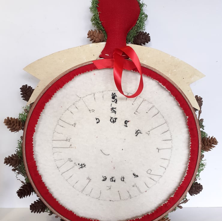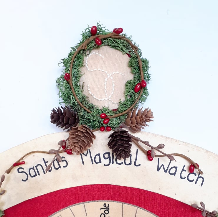 Watch Santa and his Reindeer fly around the world with this beautiful magical watch. The clock has been printed onto cotton which I've attached into red fabric which is then inserted into a bamboo embroidery hoop. I've hand written 'Santa's Magical Watch' onto recycled card and the 'SC' sign at the very top has been embroidered on using cotton thread and finished off using red pip berries and, dried moss and cones. The hoop is framed using a selection of artificial pine cones and dried moss which have been attached using crafters glue.