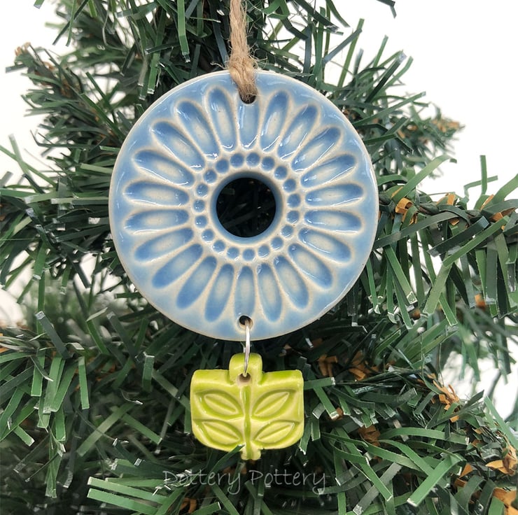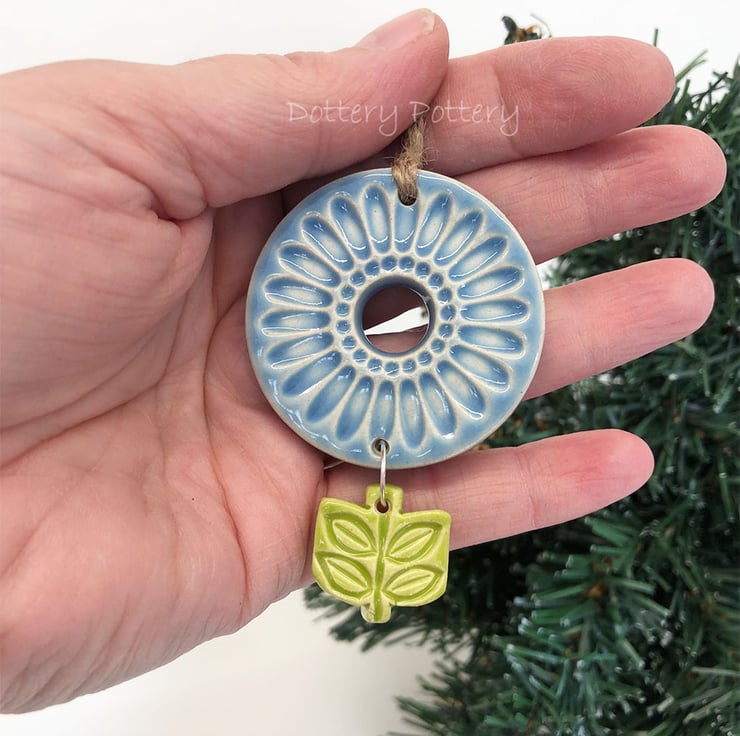 This flower deoration is made from white earthenware clay, imprinted with pattern and finished with a bright, glossy glaze. It has been fired twice, once to the bisque stage and then a second firing for the glaze. It measures 7 centimetres high x 4.5cm wide x 5mm thick.