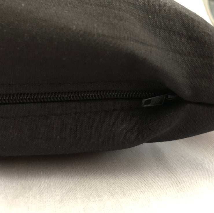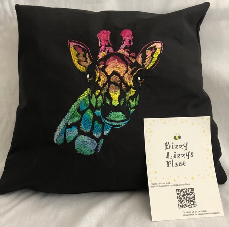 This cover has a colourful giraffe embroidered onto a black cotton fabric and has a zip closure on the bottom.