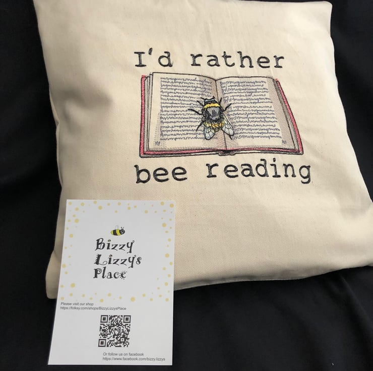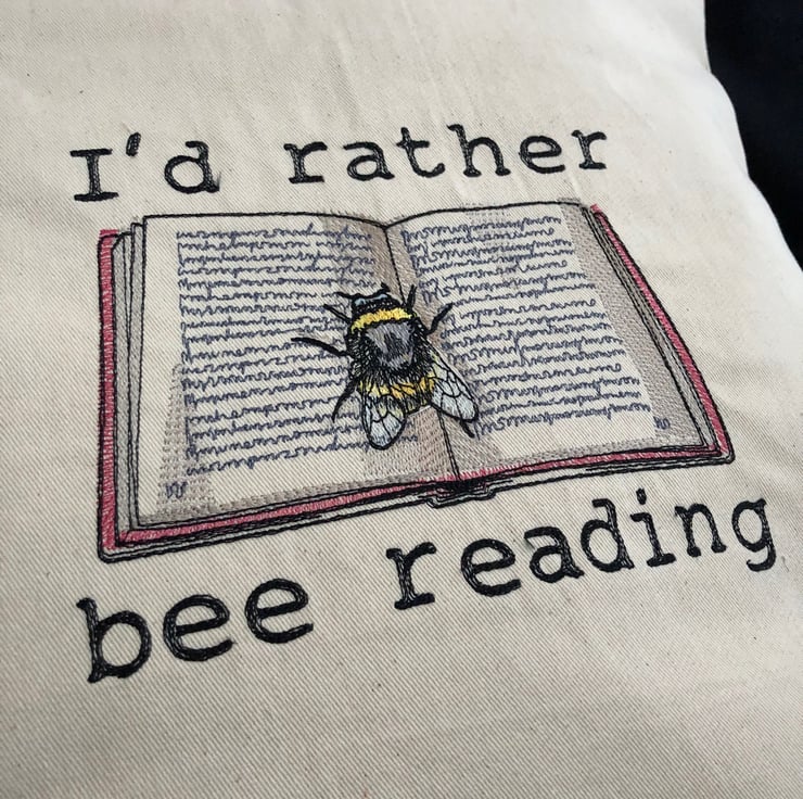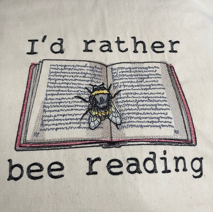 This cover has a lovely book and bee embroidered onto a thick calico cotton fabric and has a zip closure on the bottom.