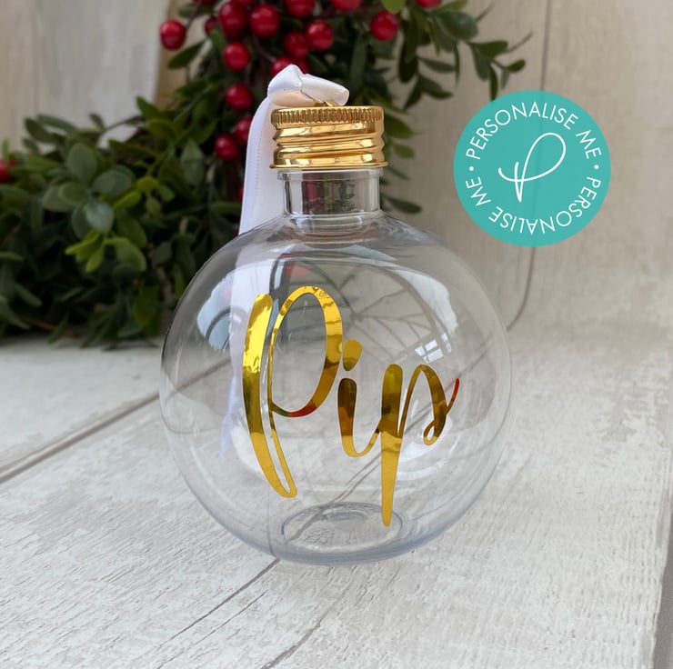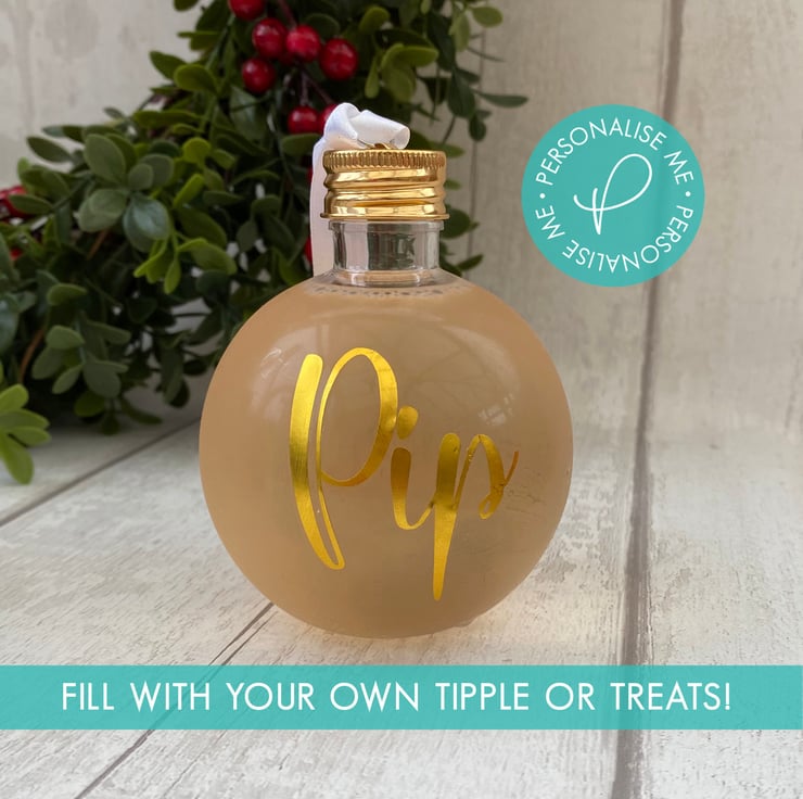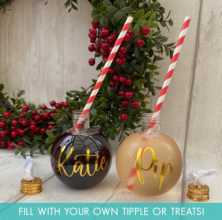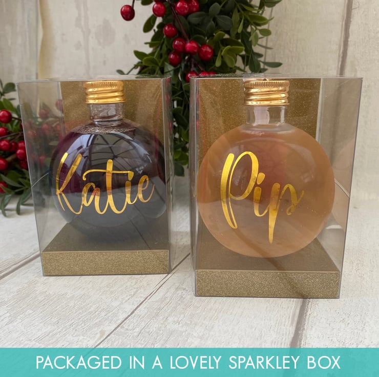 Personalised using high quality gold vinyl, each bauble is packaged in a matching sparkly box, ready to give to the recipient, all you need to do is add your chosen drinktreats.