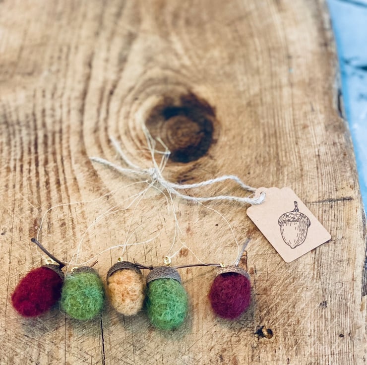 Five adorable little hand felted acorns, using sustainably sourced wool and wearing a locally foraged acorn hat. Strung on fine pale gold thread.