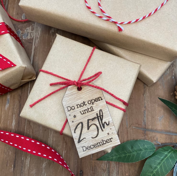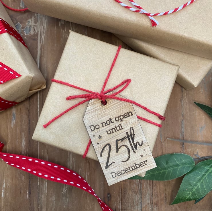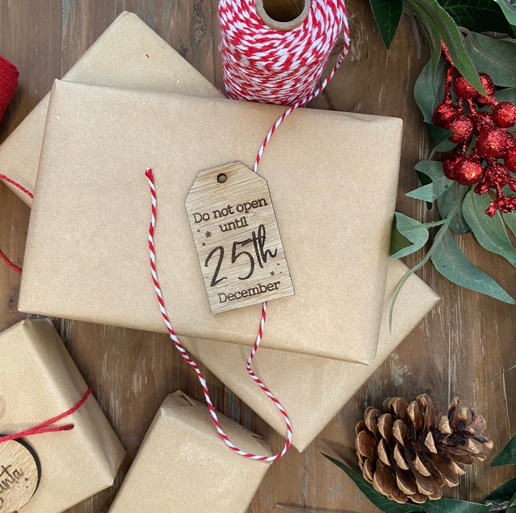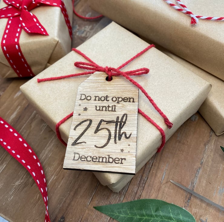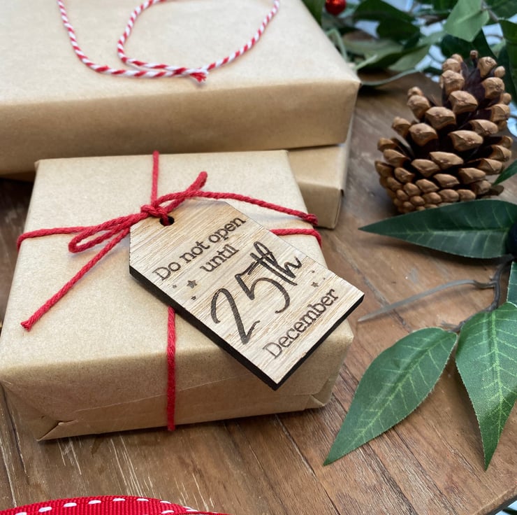 Engraved with the wording: 'Do Not Open Until 25th December', you can even write on the back of the tags who the item is from. A ball point pen (Biro) is best. We DO NOT recommend using a felt tip pen, as this bleeds into the wood.
