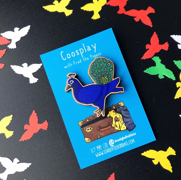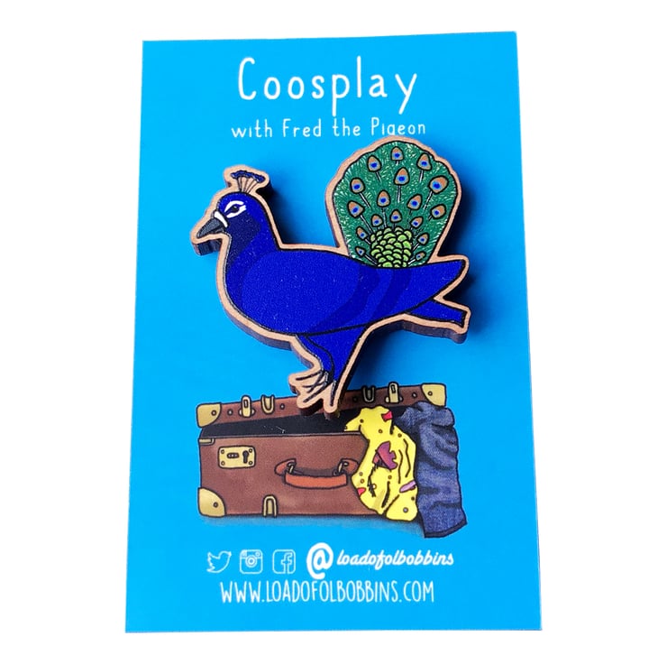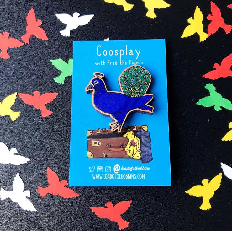 A huge fan of coosplay my illustrated pigeon friend Fred is proud as a peacock. From my original illustrations I have created a range of fun brooches, perfect for fans of pigeons or anyone who likes a chuckle.