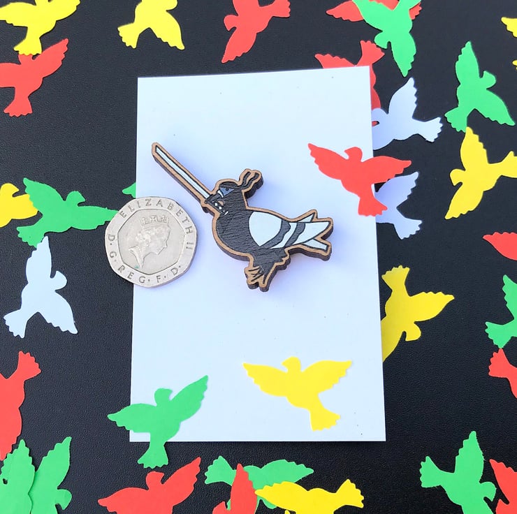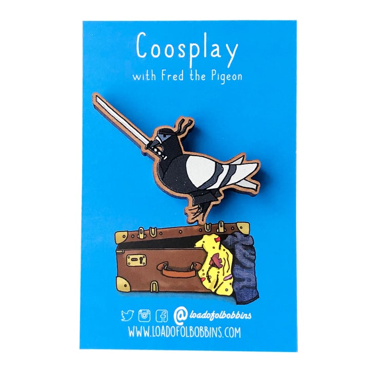A huge fan of coosplay my illustrated pigeon friend Fred has engaged his stealth mode and become a ninja. From my original illustrations I have created a range of fun brooches, perfect for fans of pigeons or anyone who likes a chuckle.