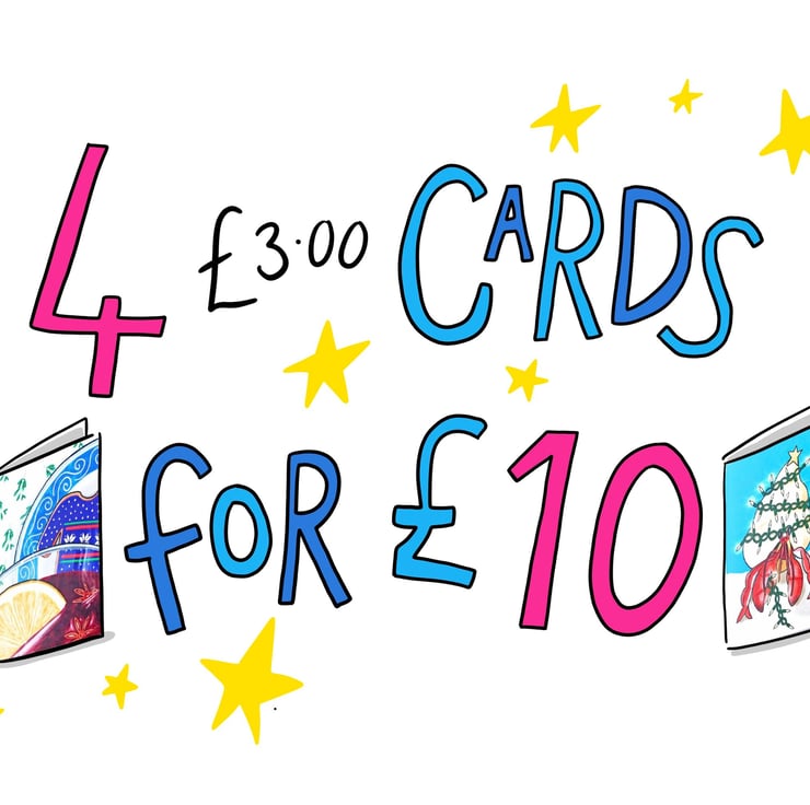 Like it says above, this offer allows you to buy any 4 of my printed illustration cards normally priced at £3.00 for the discounted price of £10. This can include any combo including multiples of the same. Just list which 4 cards you'd like to purchase in the comments box when you checkout.