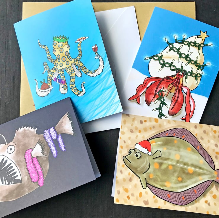 All my cards are from my own original illustrations and are blank inside, so they work equally well as greetings cards or notecards.