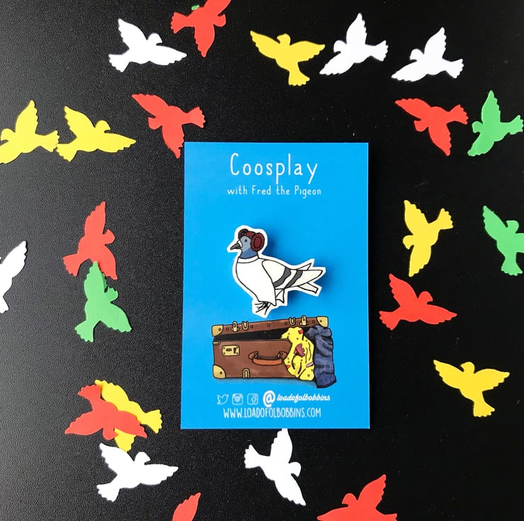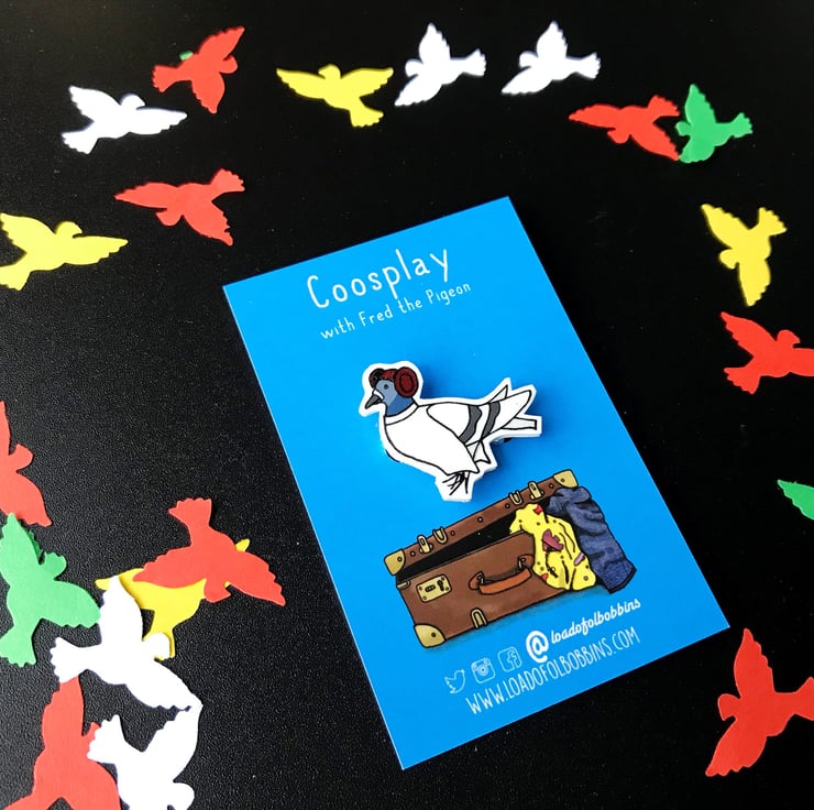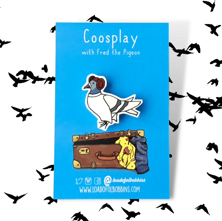 My illustrated pigeon friend is a huge fan of coosplay, this time he's immersed himself in the wonderful world of classic Sci-Fi. I have created a range of fun brooches taken from my illustrations, perfect for fans of pigeons or space adventures alike.