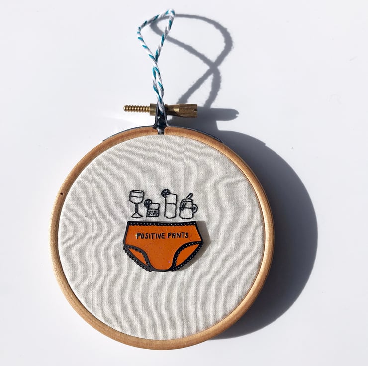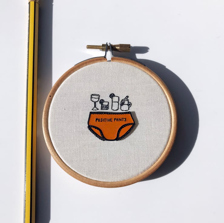 Pins and Needles is inspired by two of my favourite things enamel pins and embroidery! When not snazzing up a jacket I wanted to create somewhere new and unique for enamel pins to reside, that not only acts as a handy storage place but as a piece of art in it's own right. So with my trusty needle and thread in hand I've created teeny stitched responses to some of my favourite enamel pins. With this first series of ten hoops I've had the honour of collaborating with the fabulous Amy from Hello Treacle using her 'Warrior' and 'Positive Pants' pins for inspiration.