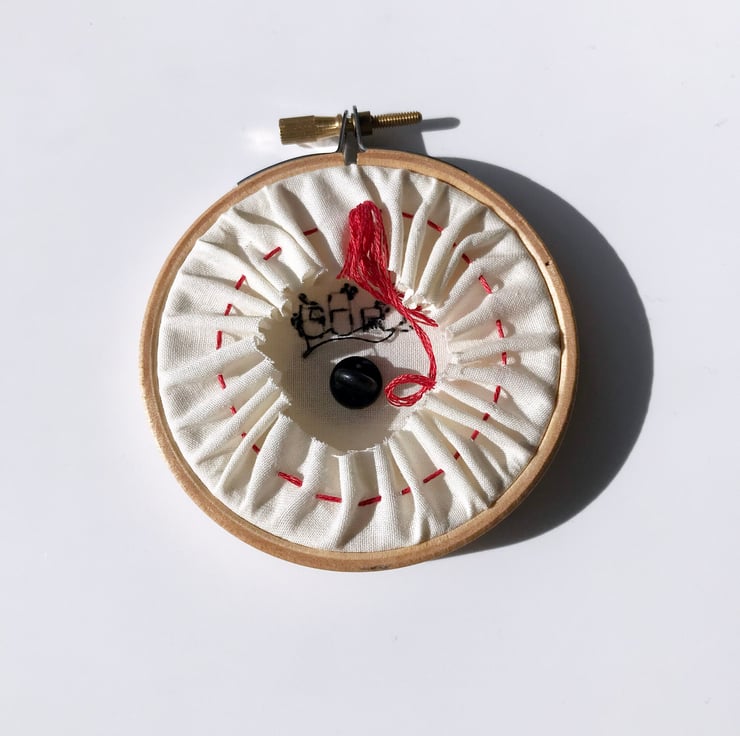 Each 3 inch hoop is a limited edition embroidery and comes with the enamel pin attached with a rubber clutch so it can easily be taken off the hoop when you want to wear it, there's also a loop of bakers twine tied to the screw at the top to enable easy hanging. All pieces are signed and dated by me around the edge of the hoop. They are all delicately hand sewn on cotton with a single strand of black embroidery floss. As you can see in the photograph above I gather the excess fabric at the back together with running stitch that is pulled tight and tied in a bow. To re-stretch the embroidery, if it should loosen in the hoop over time all you need to do is untie the bow at the back, loosen the gather and pull the fabric taught again, tighten the screw at the top further,
