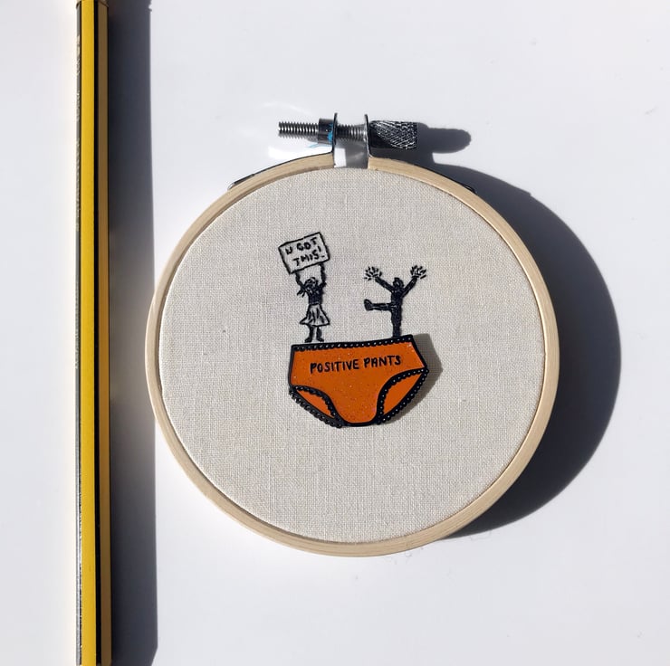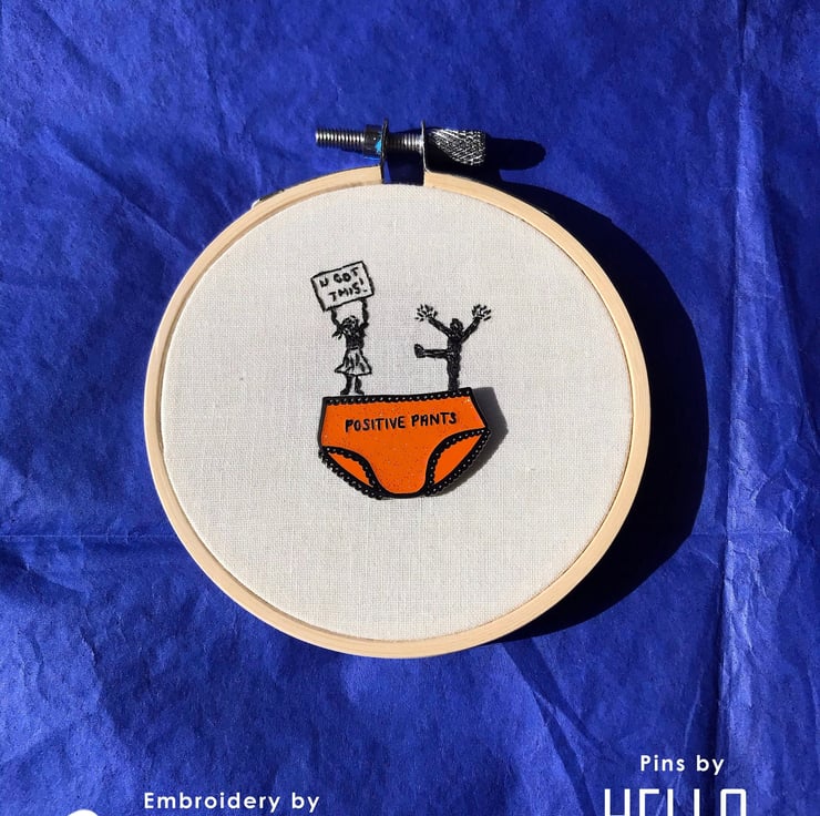 Pins and Needles is inspired by two of my favourite things enamel pins and embroidery! When not snazzing up a jacket I wanted to create somewhere new and unique for enamel pins to reside, that not only acts as a handy storage place but as a piece of art in it's own right. So with my trusty needle and thread in hand I've created teeny stitched responses to some of my favourite enamel pins. With this first series of ten hoops I've had the honour of collaborating with the fabulous Amy from Hello Treacle using her 'Warrior' and 'Positive Pants' pins for inspiration.