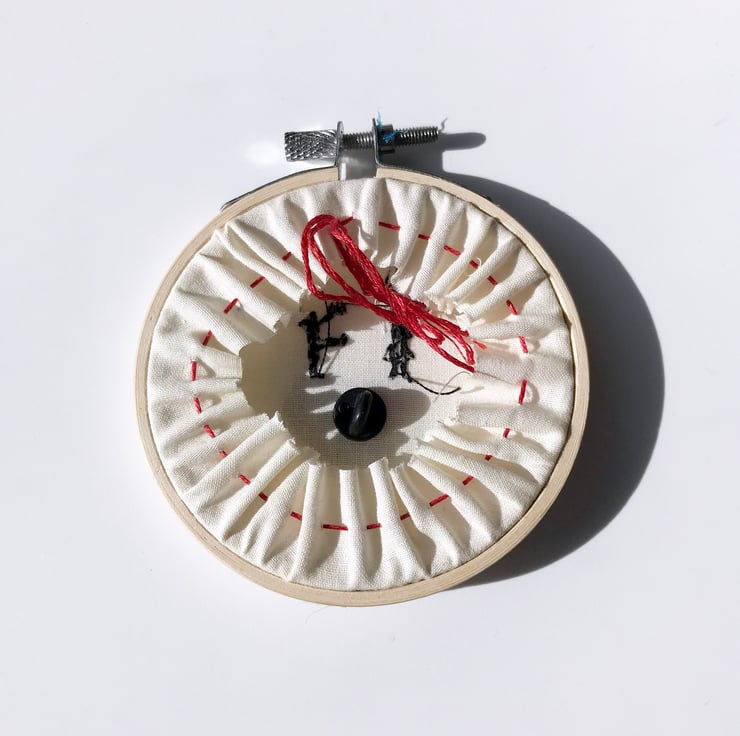 Each 3 inch hoop is a limited edition embroidery and comes with the enamel pin attached with a rubber clutch so it can easily be taken off the hoop when you want to wear it, there's also a loop of bakers twine tied to the screw at the top to enable easy hanging. All pieces are signed and dated by me around the edge of the hoop. They are all delicately hand sewn on cotton with a single strand of black embroidery floss. As you can see in the photograph above I gather the excess fabric at the back together with running stitch that is pulled tight and tied in a bow. To re-stretch the embroidery, if it should loosen in the hoop over time all you need to do is untie the bow at the back, loosen the gather and pull the fabric taught again, tighten the screw at the top further, re-gather and tie the bow.