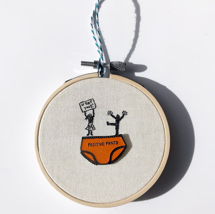 With this hoop you have your very own cheer squad giving you moral support which you'll hopefully remember and pick you up when wearing the 'Positive Pants' enamel pin.