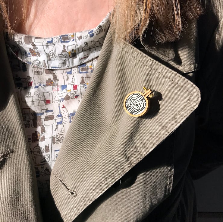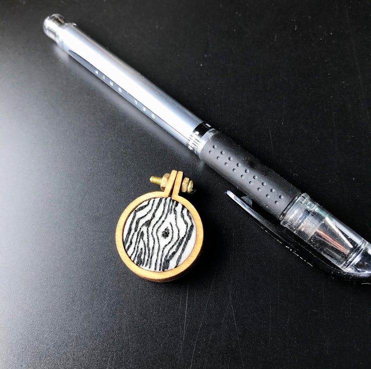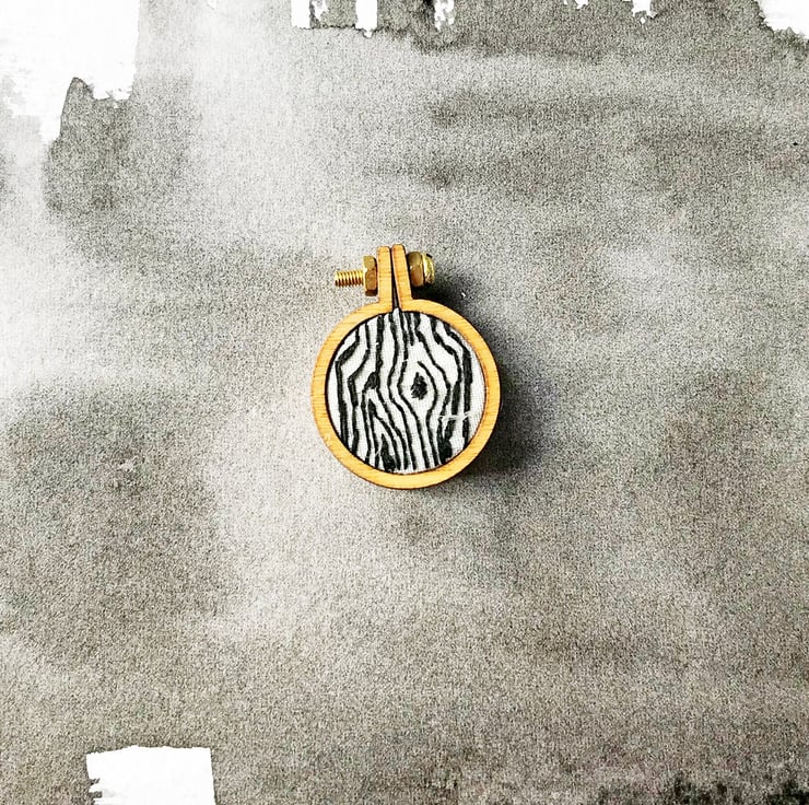 This snazzy brooch is ready to brighten up any lapel, hand embroidered using a single strand of black thread on to a cream cotton material and depicts the wonderful patterns of tree bark in monochrome.