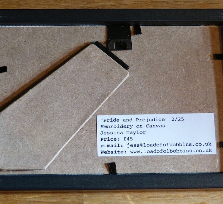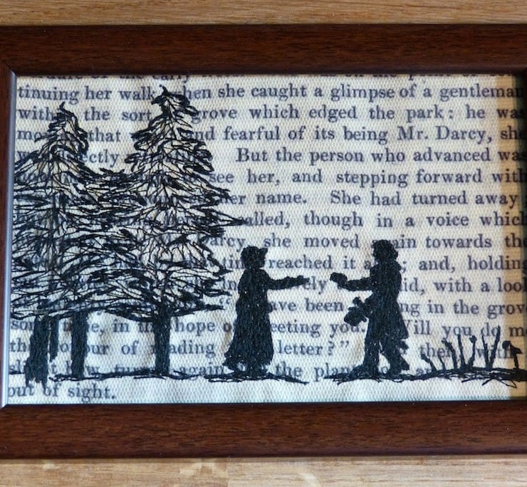This free motion machine embroidery shows Elizabeth Bennet and Mr Darcy meeting in the woods in Jane Austen's classic novel Pride and Prejudice. The image has been stitched directly on top of a canvas print displaying the original text from the novel that inspired my work. This is part of a larger textile art series I've created inspired by the wonderful characters and stories within classic literature.