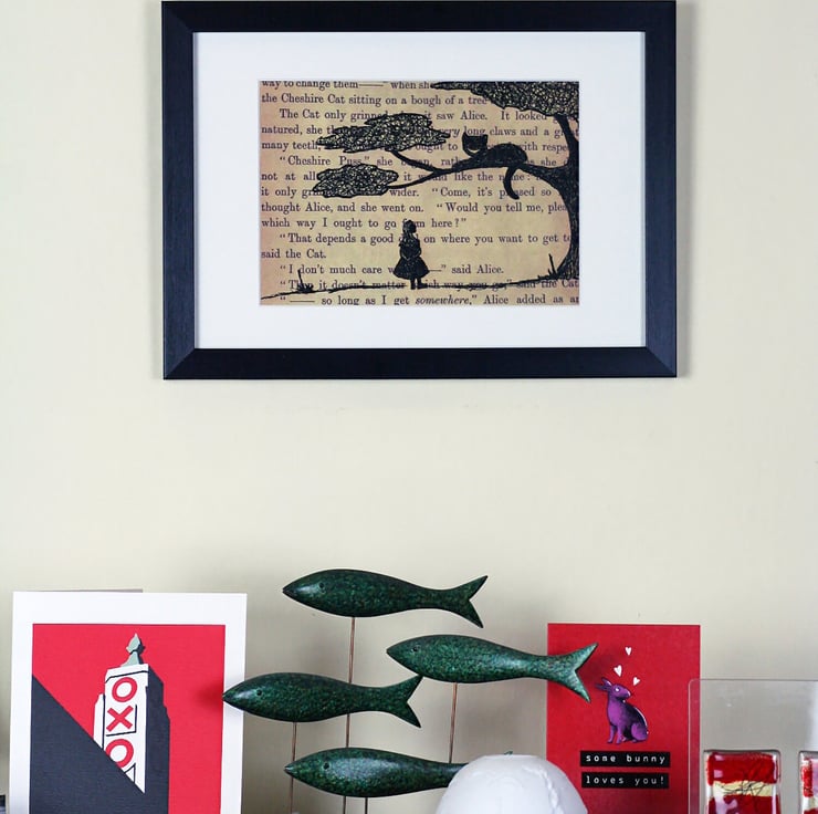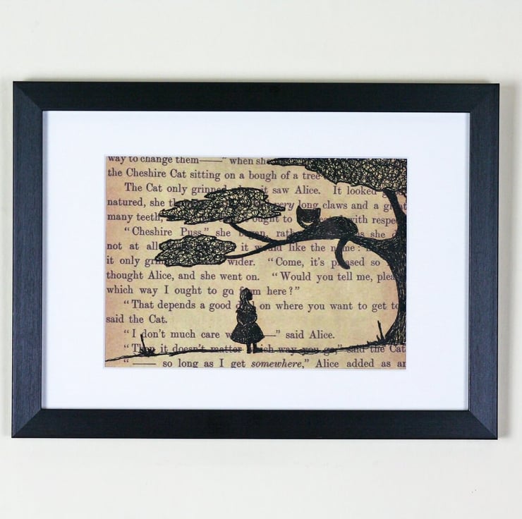 This classic literature - Alice in Wonderland Cheshire Cat Silhouette Framed Large Embroidery Illustration is a larger version of my original postcard size pieces. These larger pieces were stitched for my first solo exhibition in the summer and make quite an impact hanging on any wall.
