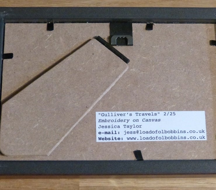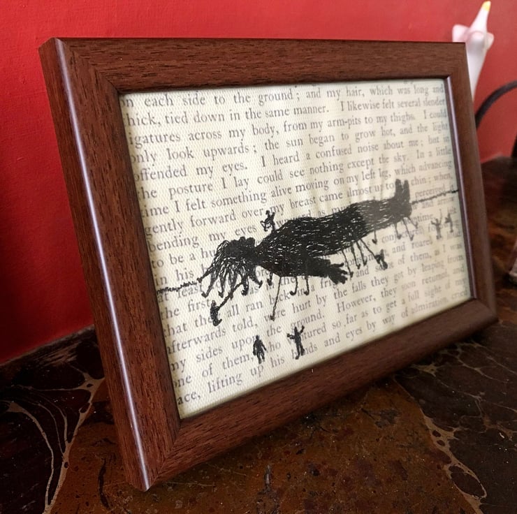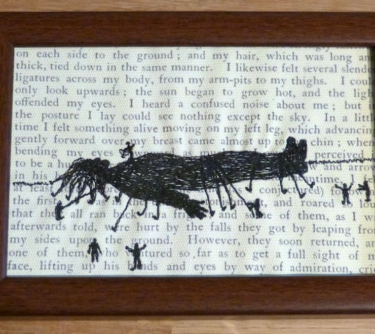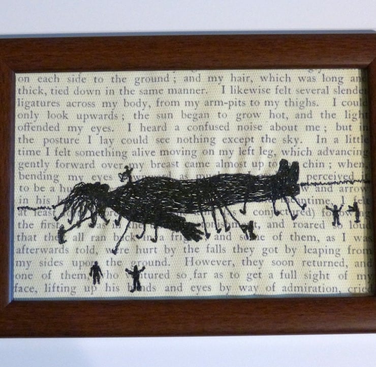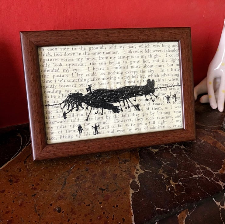 This free motion machine embroidery shows Gulliver's first troublesome moments in Lilliput in Johnathan Swift's classic novel Gulliver's Travels. The image has been stitched directly on top of a canvas print displaying the original text from the novel that inspired my work. This is part of a larger textile art series I've created inspired by the wonderful characters and stories within classic literature.