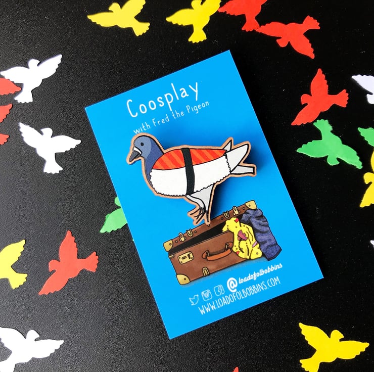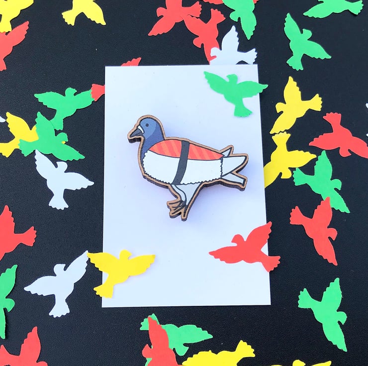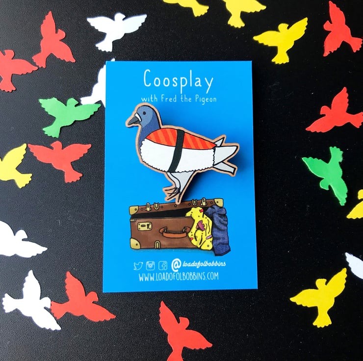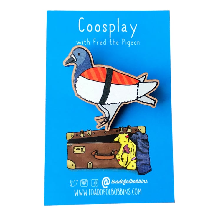 My illustrated pigeon friend Fred is a huge fan of coosplay, this time he's feeling a bit peckish and he loves a bit of shushi. From my original illustrations I have created a range of fun brooches, perfect for fans of pigeons or anyone who likes a chuckle.