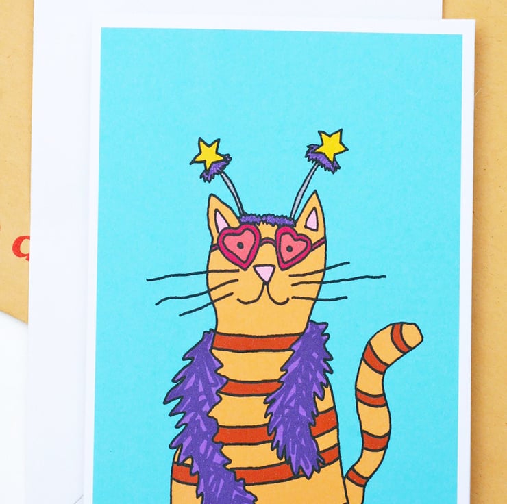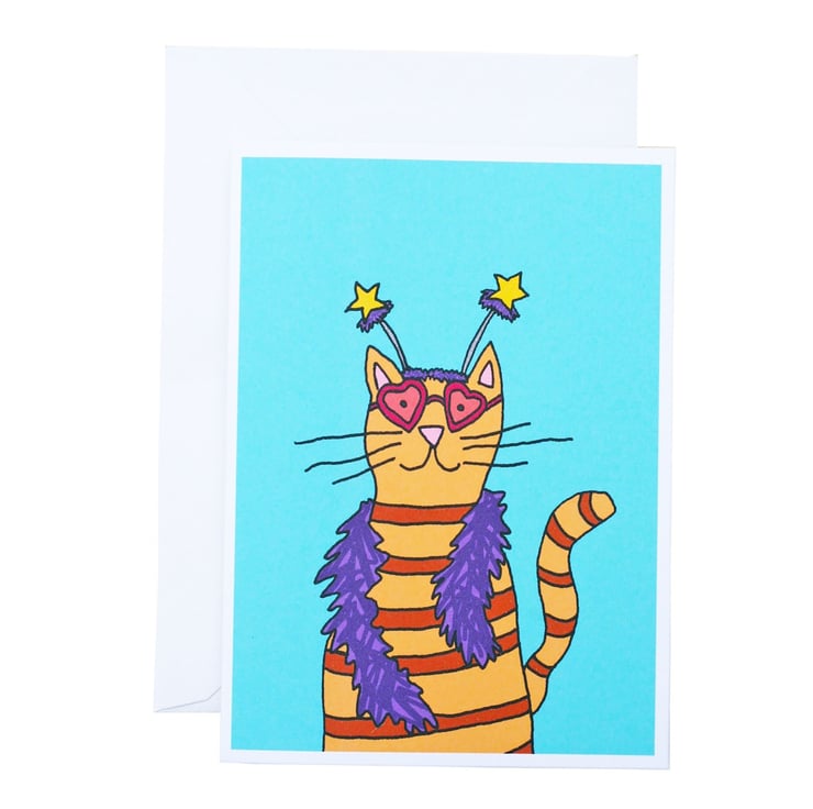 In this A6 illustrated this cool cat is ready to party complete with feather boa, snazzy heart glasses and star headband!