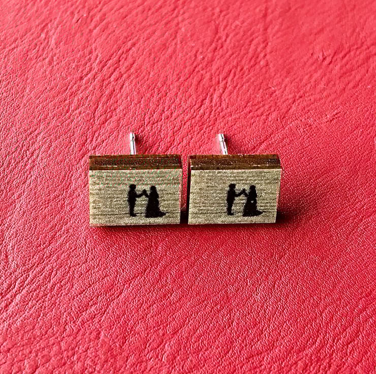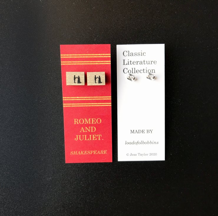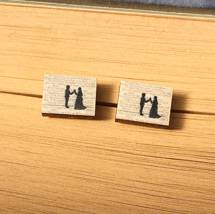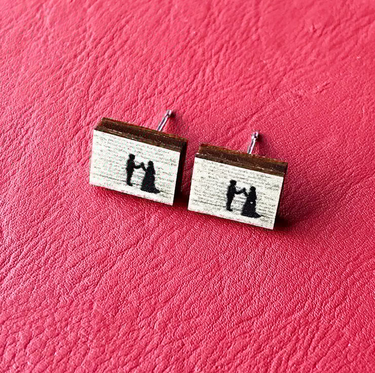 This cute pair of wooden studs show Romeo and Juliet in the famous 'holy palmers kiss' scene from Shakespeare's classic play. The images are created from my original embroidered illustrations, this range of earrings are perfect for book lovers like myself. They'd make a lovely gift or maybe even a treat for yourself!