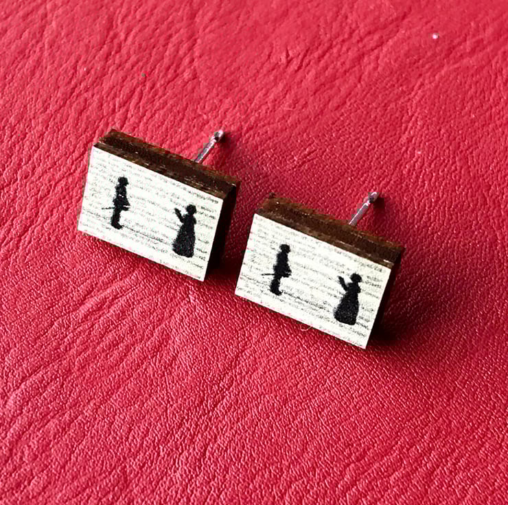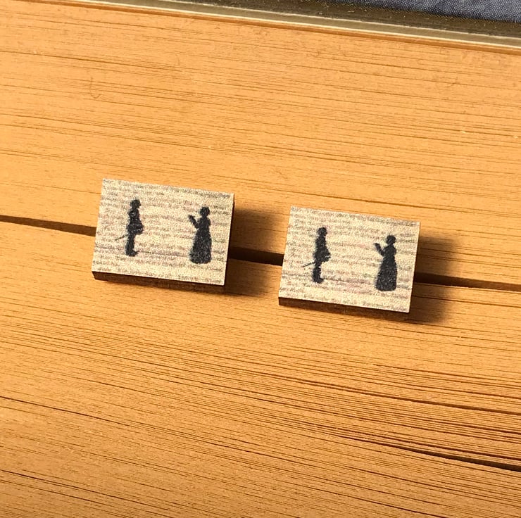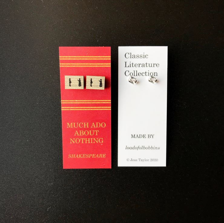 This cute pair of wooden studs show one of the many infamous verbal exchanges between Beatrice and Benedict in Shakespeare's Much Ado About Nothing. The images are created from my original embroidered illustrations, this range of earrings are perfect for book lovers like myself. They'd make a lovely gift or maybe even a treat for yourself!