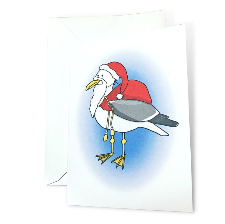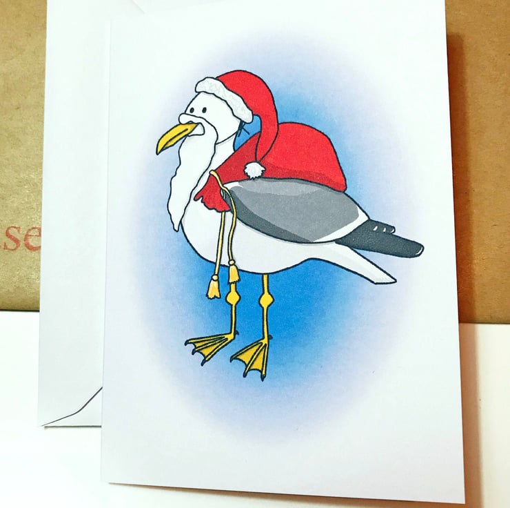 In this A6 illustrated Christmas card this seagull is dressed as Santa and ready to distribute lovely gifts to one and all!
