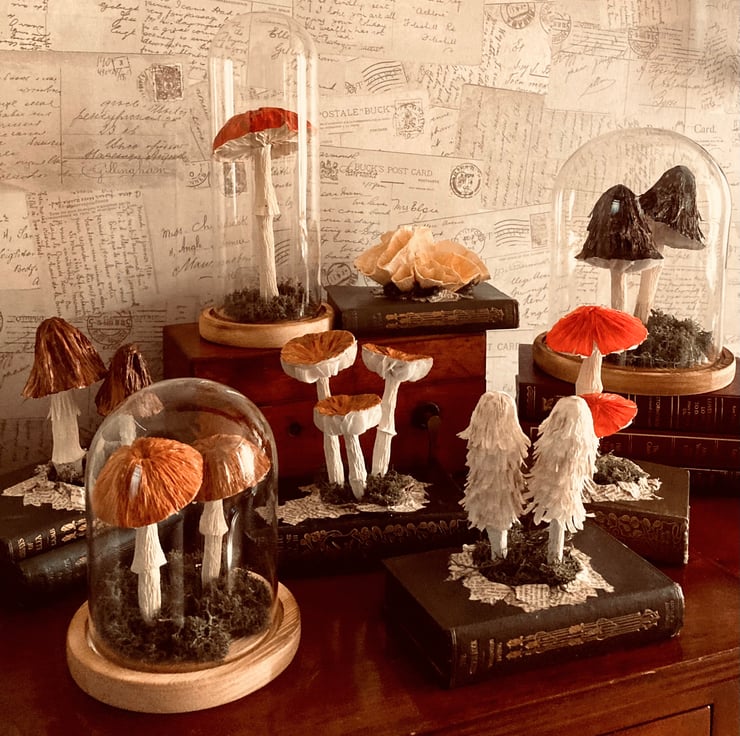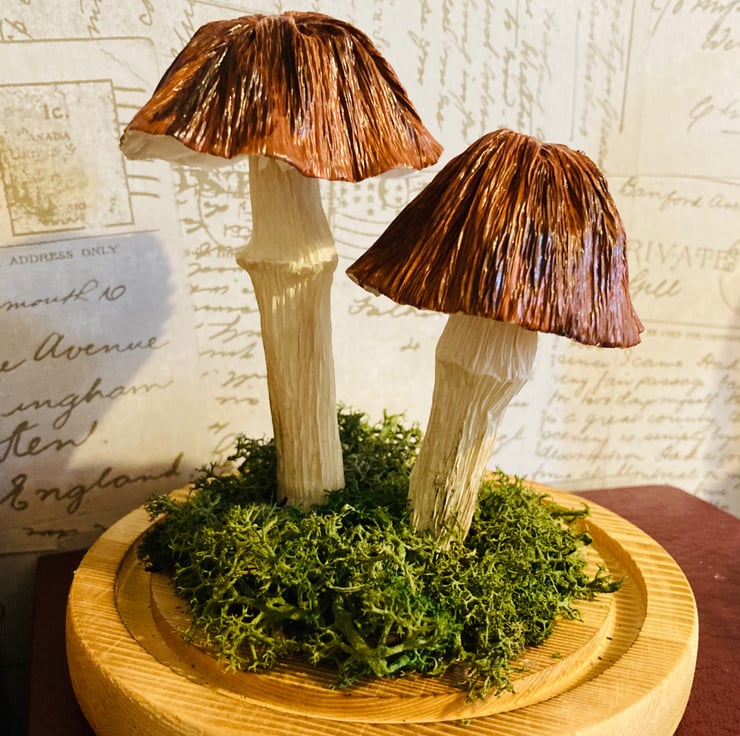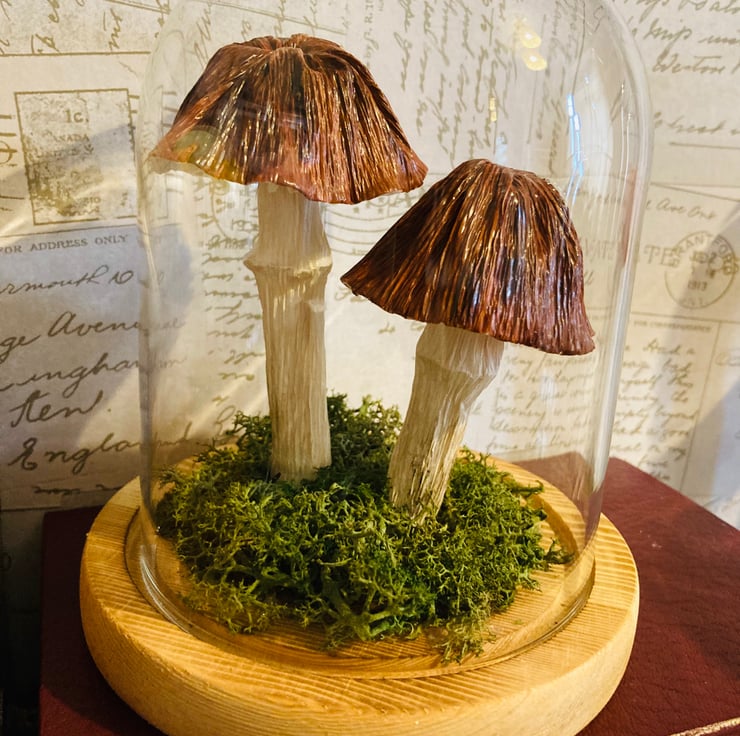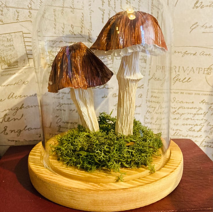 2 Brown paper woodland mushrooms in a glass dome