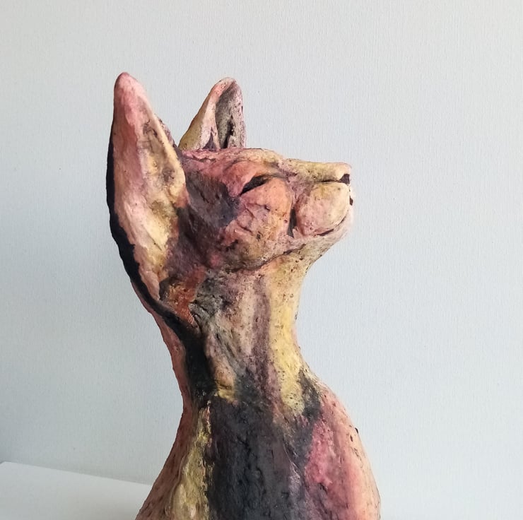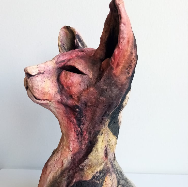 Contemporary cat sculpture made from raku clays and decorated with various slips and stains.