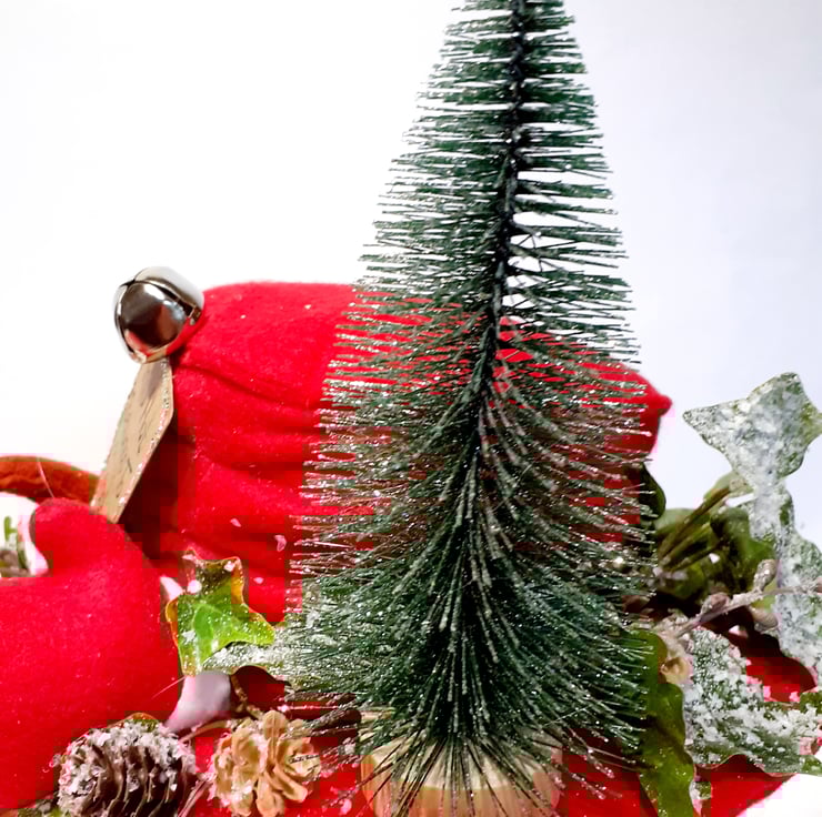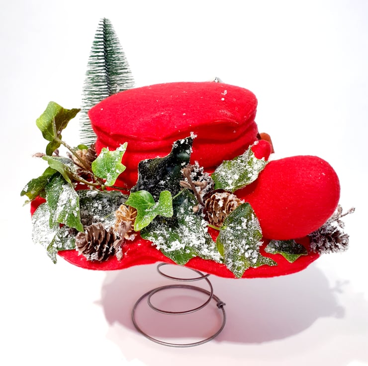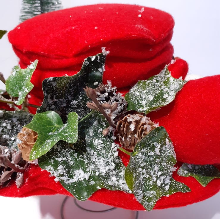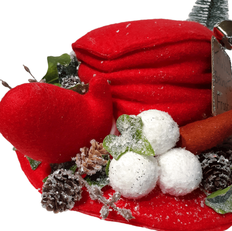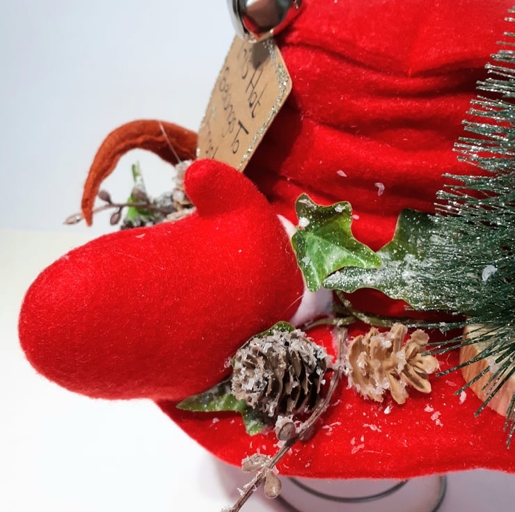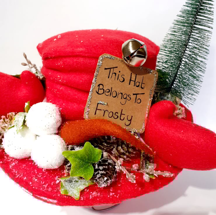 Frosty the Snowman has many hats all created by the children as they finish off decorating their own snowman. When he starts to play with the children Frosty the Snowman really doesn't want to lose his hat, so he's added a sign to his so that there is no confusion when it's time for the snowmen to head home. Made using red felt the hat and mittens are both padded with crafters wadding. The snowballs are paper mache which I've dusted with 'snow' and 'glitter'. His nose has been made out of rust felt with crafters wire inserted to shape it. The trimmings are a mixture of artificial pine cones and ivy, silver bell and a crafters Christmas tree. Frosty's hat sign is made using recycled cardboard and it too has glitter around the edge to make it sparkle. Sits on top of one of my vintage bed springs which makes it really easy to put on display in the perfect place. Won't this be just a super fun addition to your festive collection?