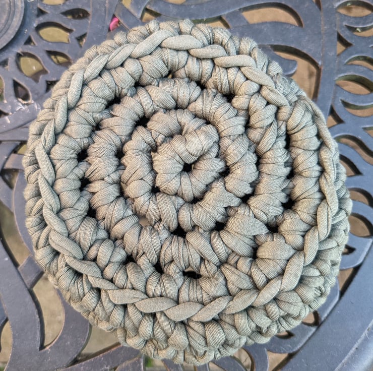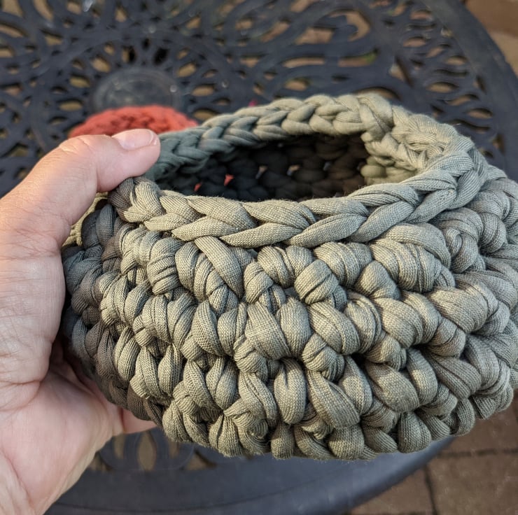 A cute little crocheted bowl with rounded sides in an olive green shade made with a super chunky T-shirt yarn. The yarn is 90% cotton and its production helps tackle the waste produced by the fashion industry by recyling it into new textile yarn. The whole recycling process is dye- and water-free. The bowl is sturdy yet flexible and keeps its shape. The T-shirt yarn gives great definition to the crochet stitches used to create it.